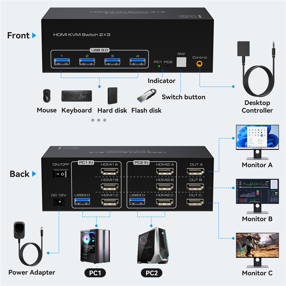 • 【 2 режима переключения】 Вы можете нажать кнопку на панели или использовать проводной пульт дистанционного управления (входит в комплект) для переключения между 2 компьютерами. Он предоставляет несколько вариантов переключения для разных сценариев. Используйте адаптер питания 12 В (входит в комплект) для питания этого KVM-переключателя с тройным монитором HDMI.