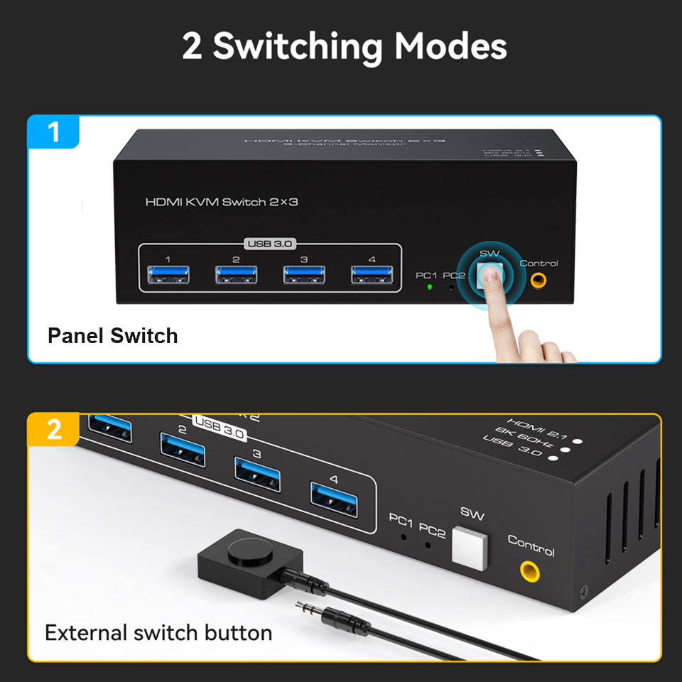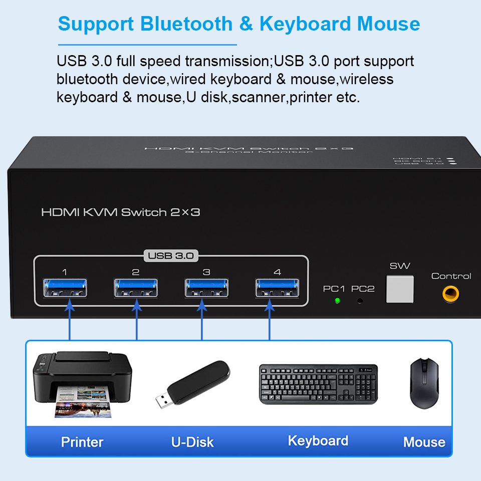 1080P при 240 Гц и вниз. 2 компьютер 3 Монитора KVM-переключатель поддерживает стандарты HDMI 2,1 и HDCP 2,3.