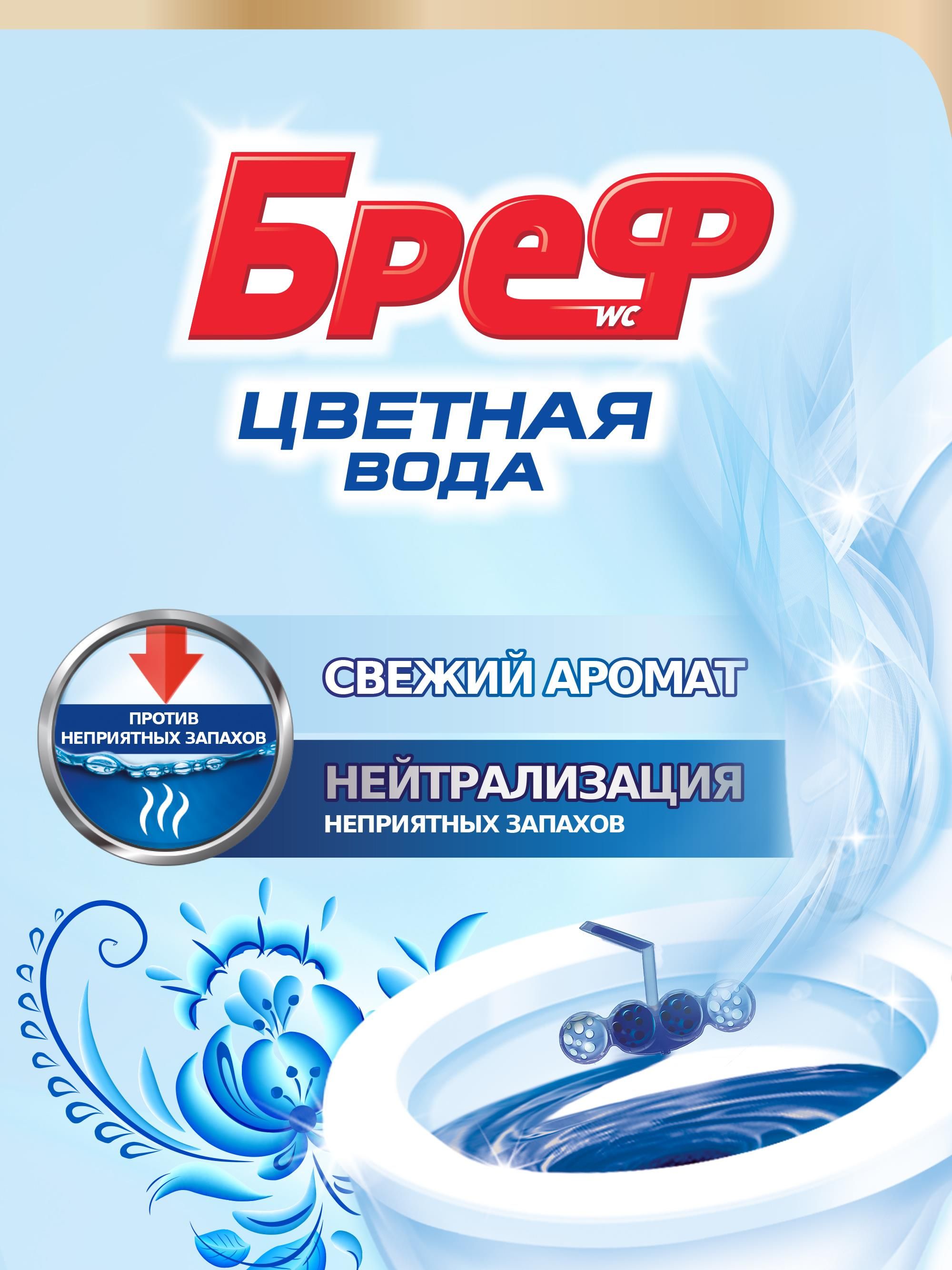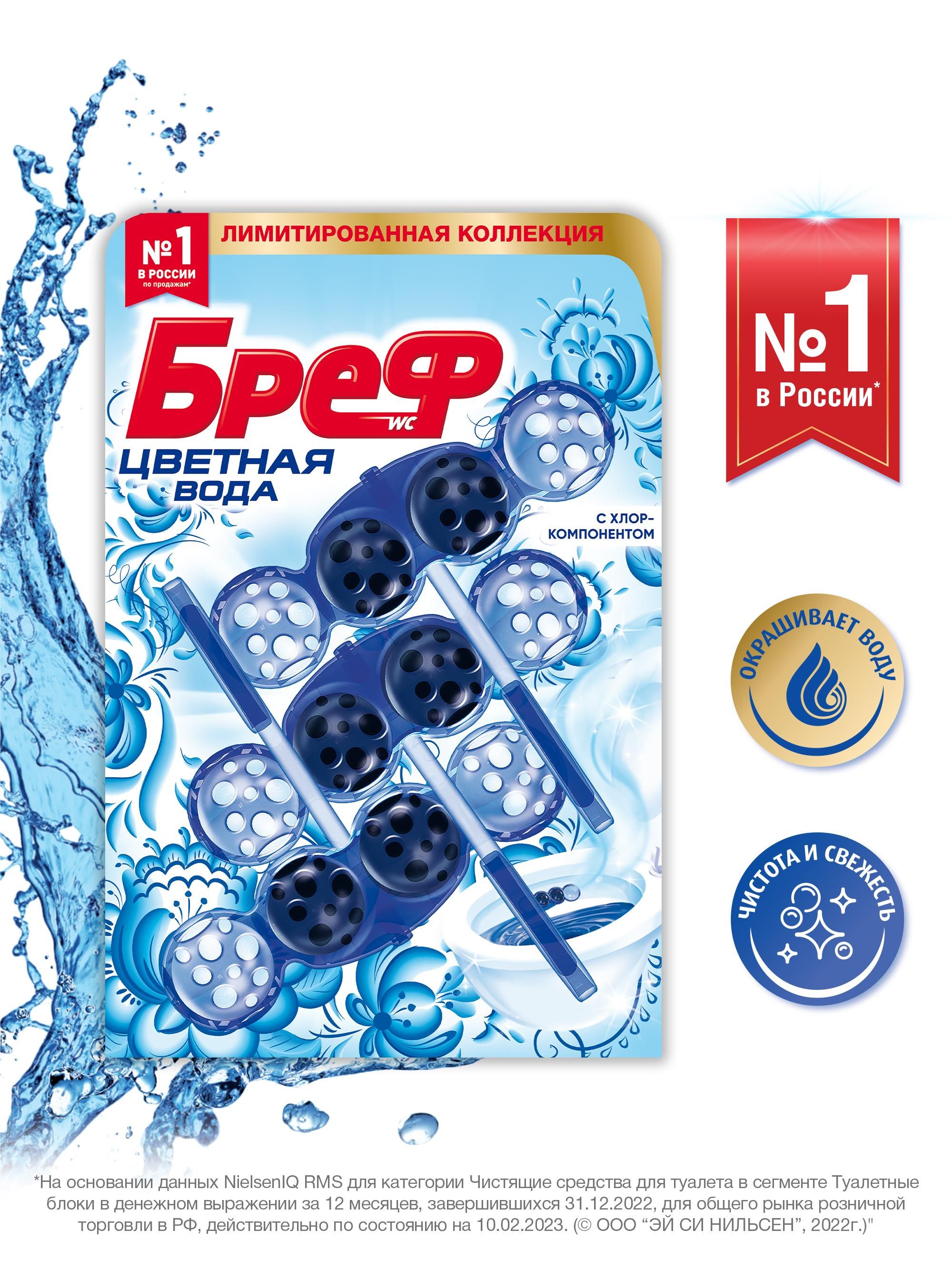 Туалетный блок Бреф Цветная Вода С хлор-компонентом в виде блока очистителя для унитаза, средство для туалета 3 блока (150г)