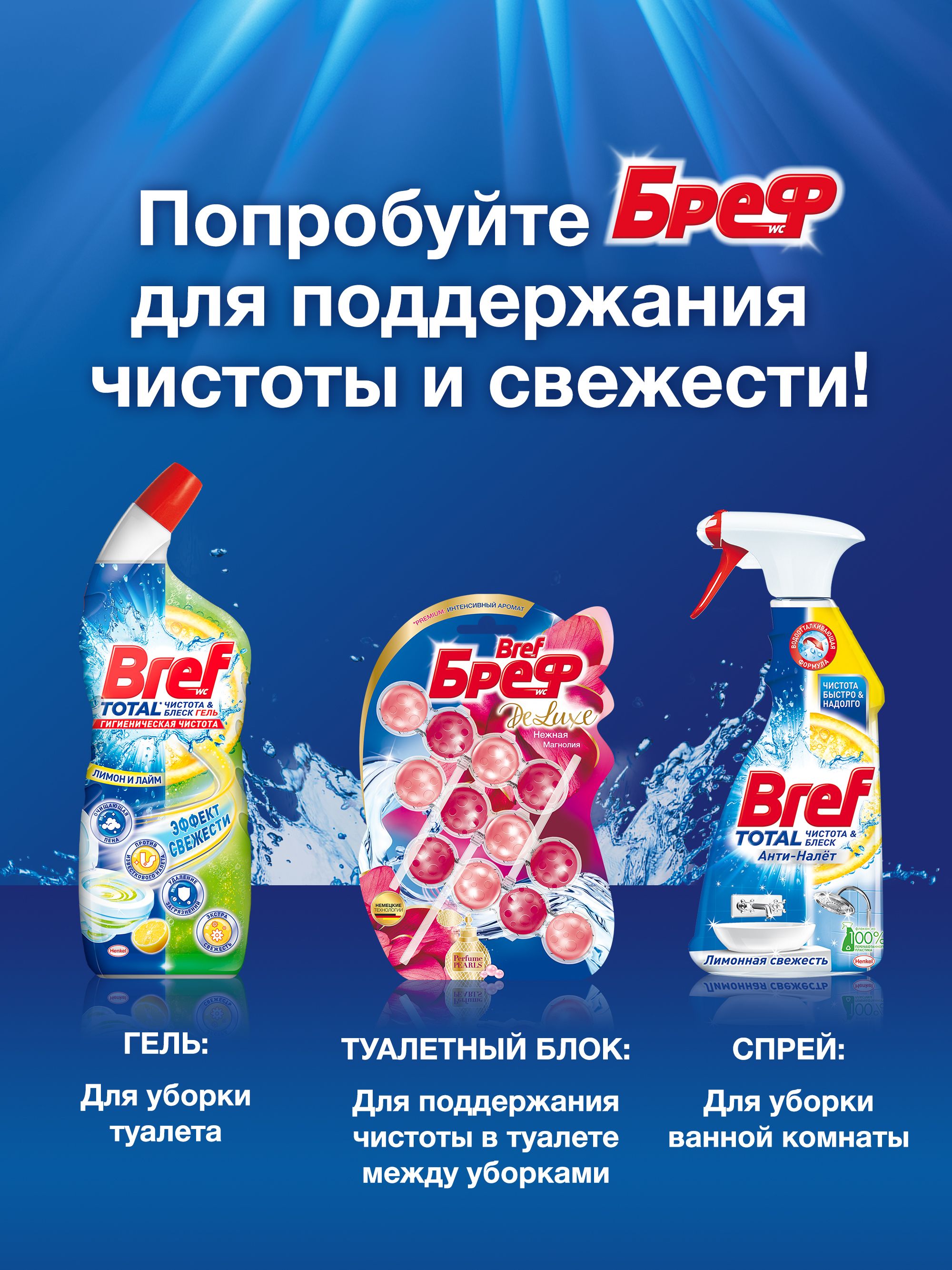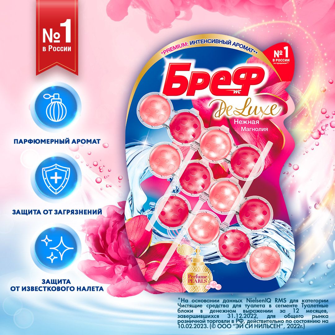 Туалетный блок Bref DeLuxe Нежная магнолия в виде блока очистителя для унитаза, средство для туалета 3 блока (150г)