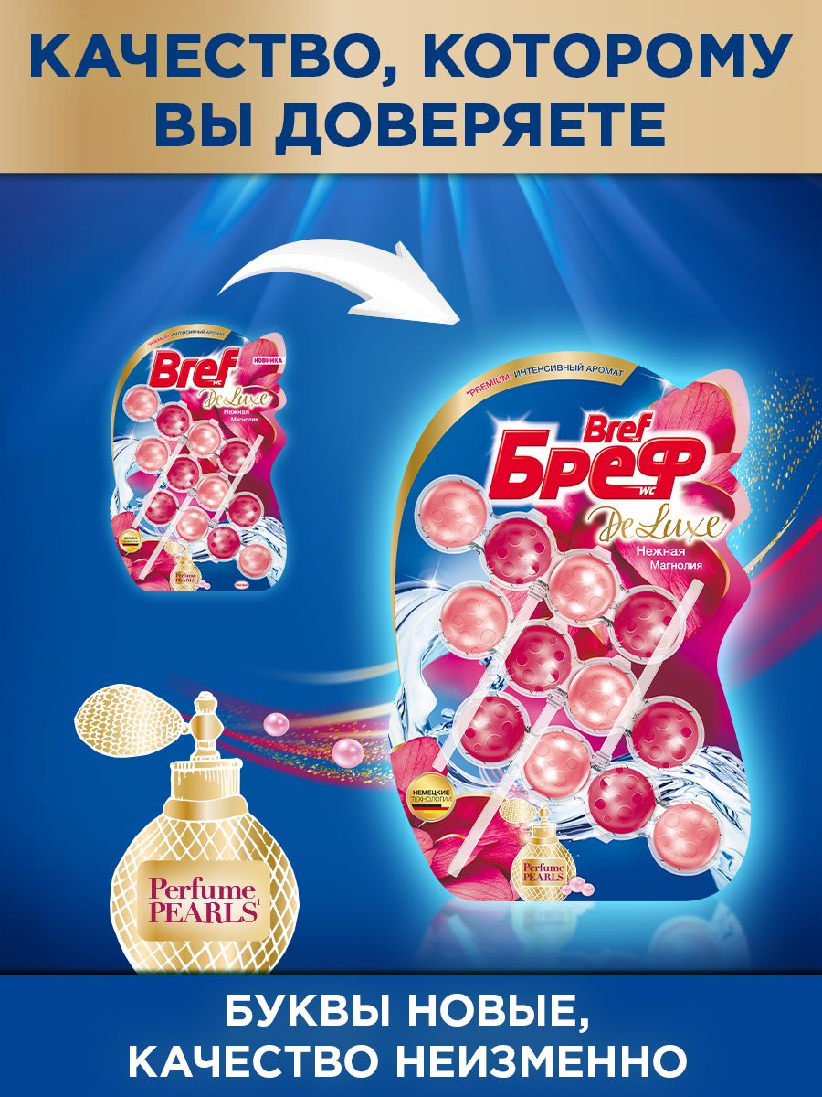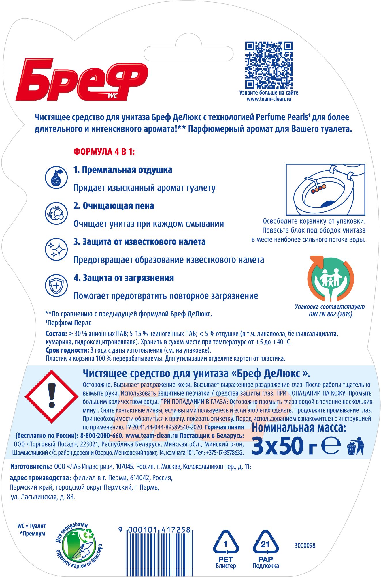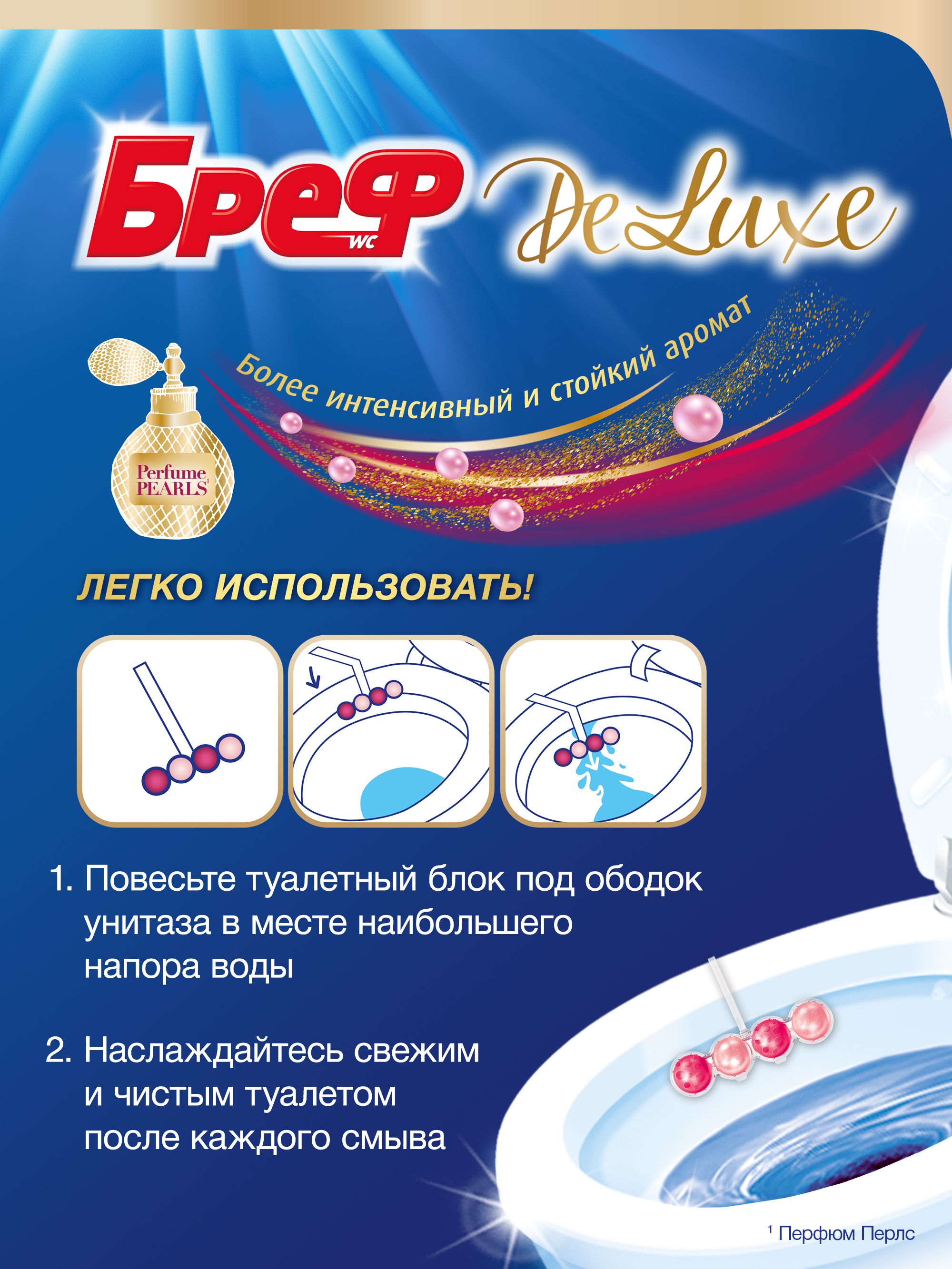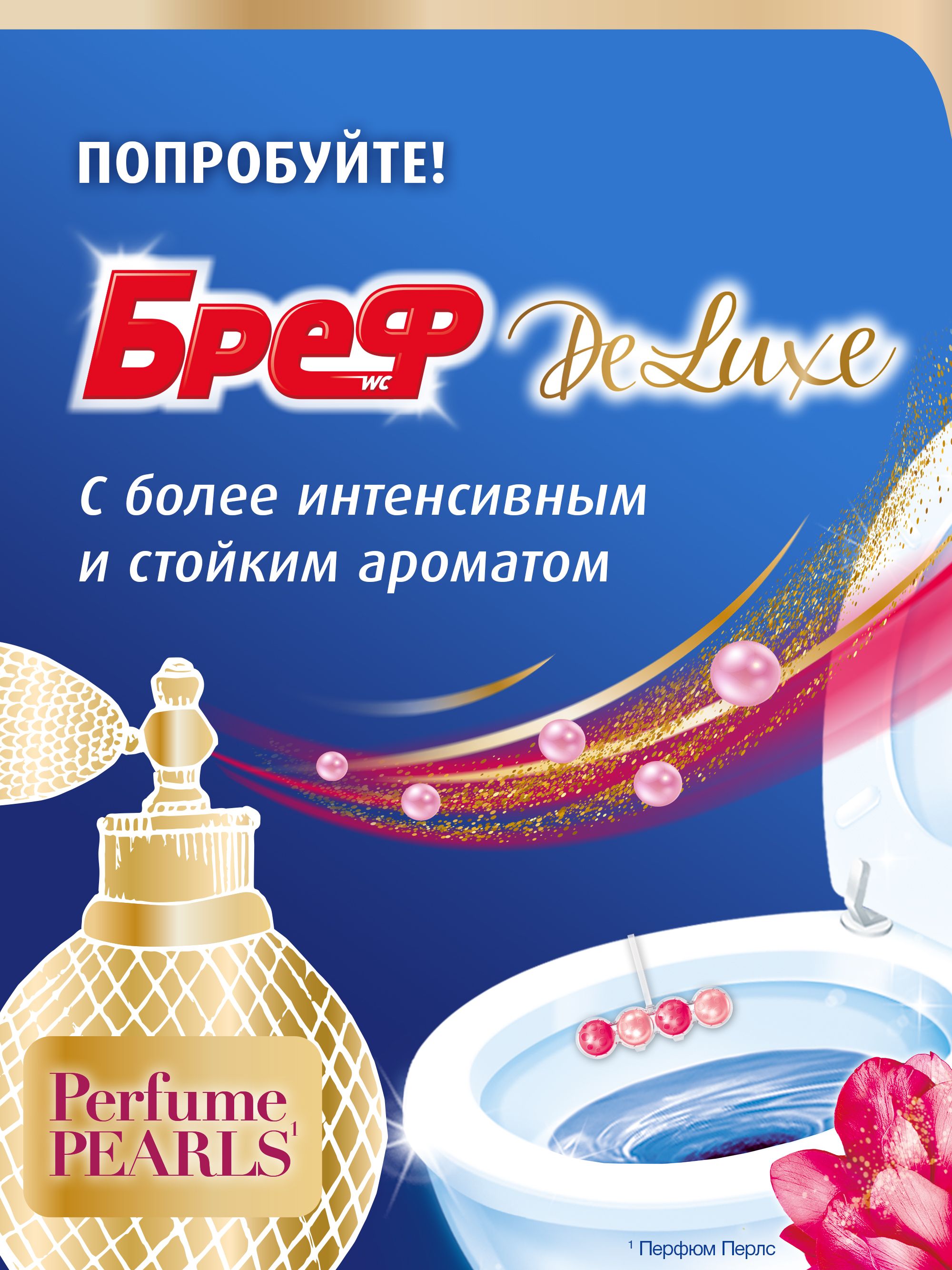 Описание: Бреф DeLuxe — подвесной туалетный блок для унитаза с технологией Перфюм Перлс для более длительного и интенсивного аромата!* Формула с технологией Перфюм Перлс действует в 4 направлениях: • придает изысканный аромат туалету благодаря премиальной отдушке; • образует очищающую пену, которая обеспечивает гигиеническую чистоту при каждом смывании; • предотвращает образование известкового налета; • помогает предотвратить повторное загрязнение; Бреф DeLuxe - парфюмерный аромат для Вашего туалета. *По сравнению с предыдущей формулой Бреф ДеЛюкс.