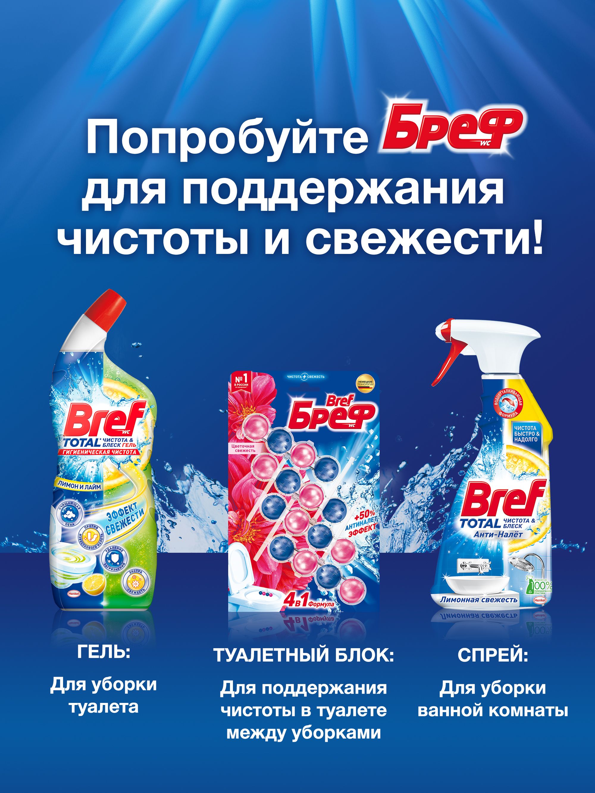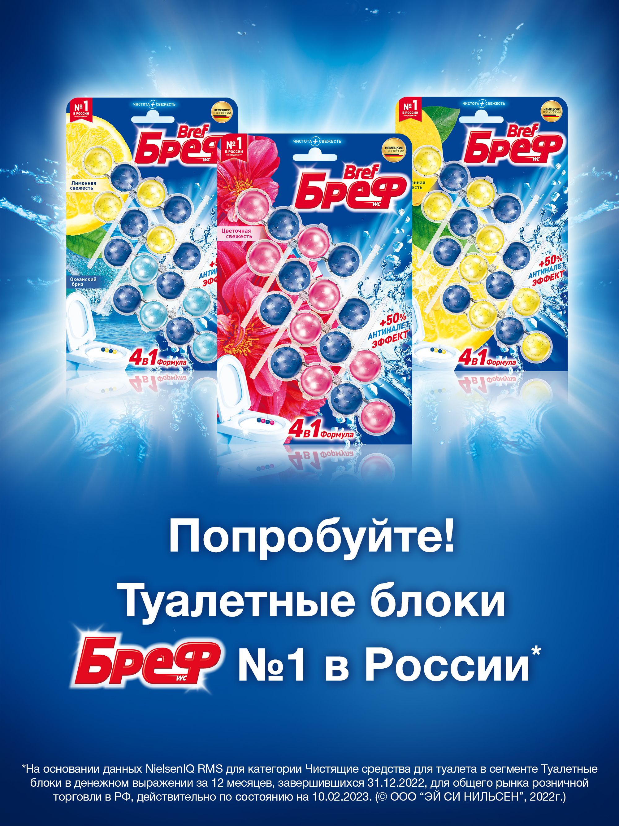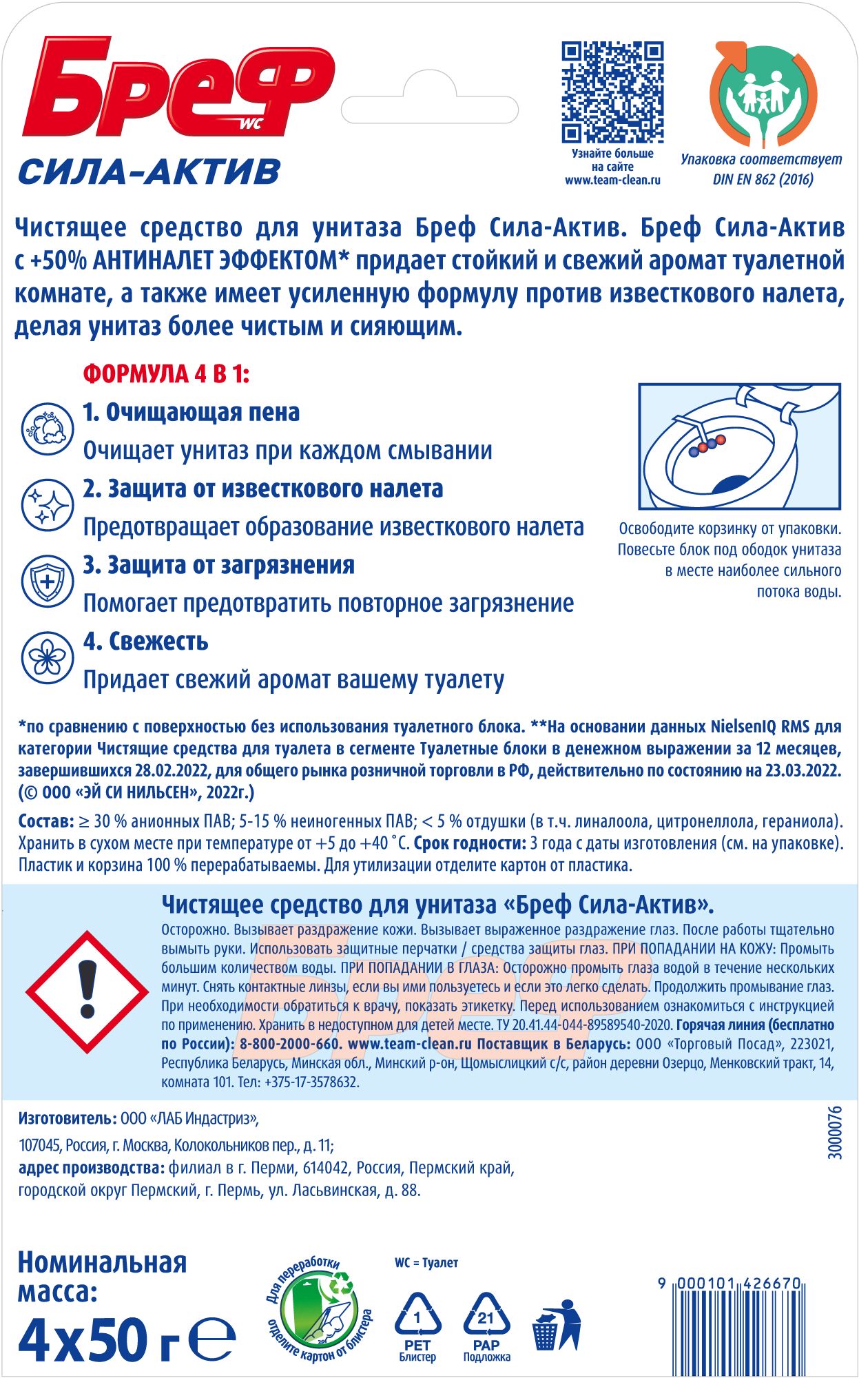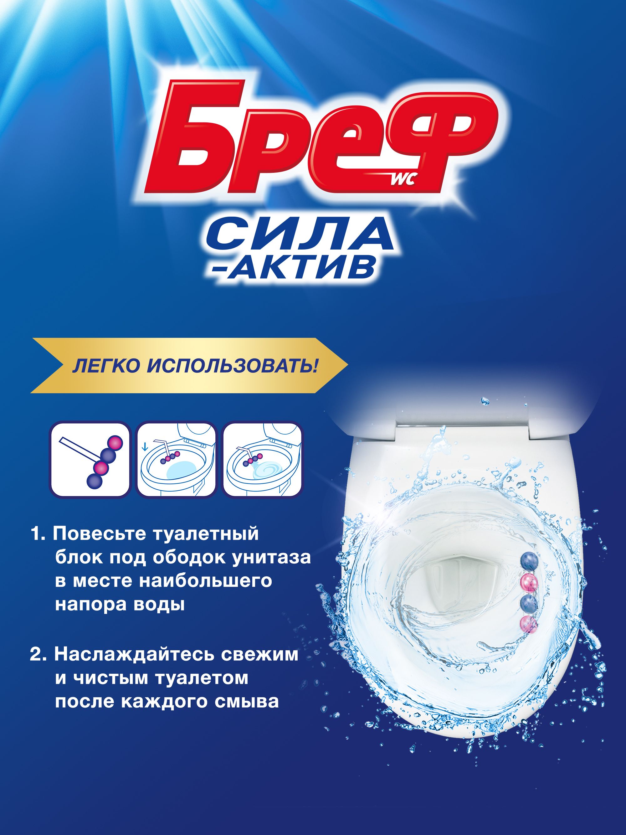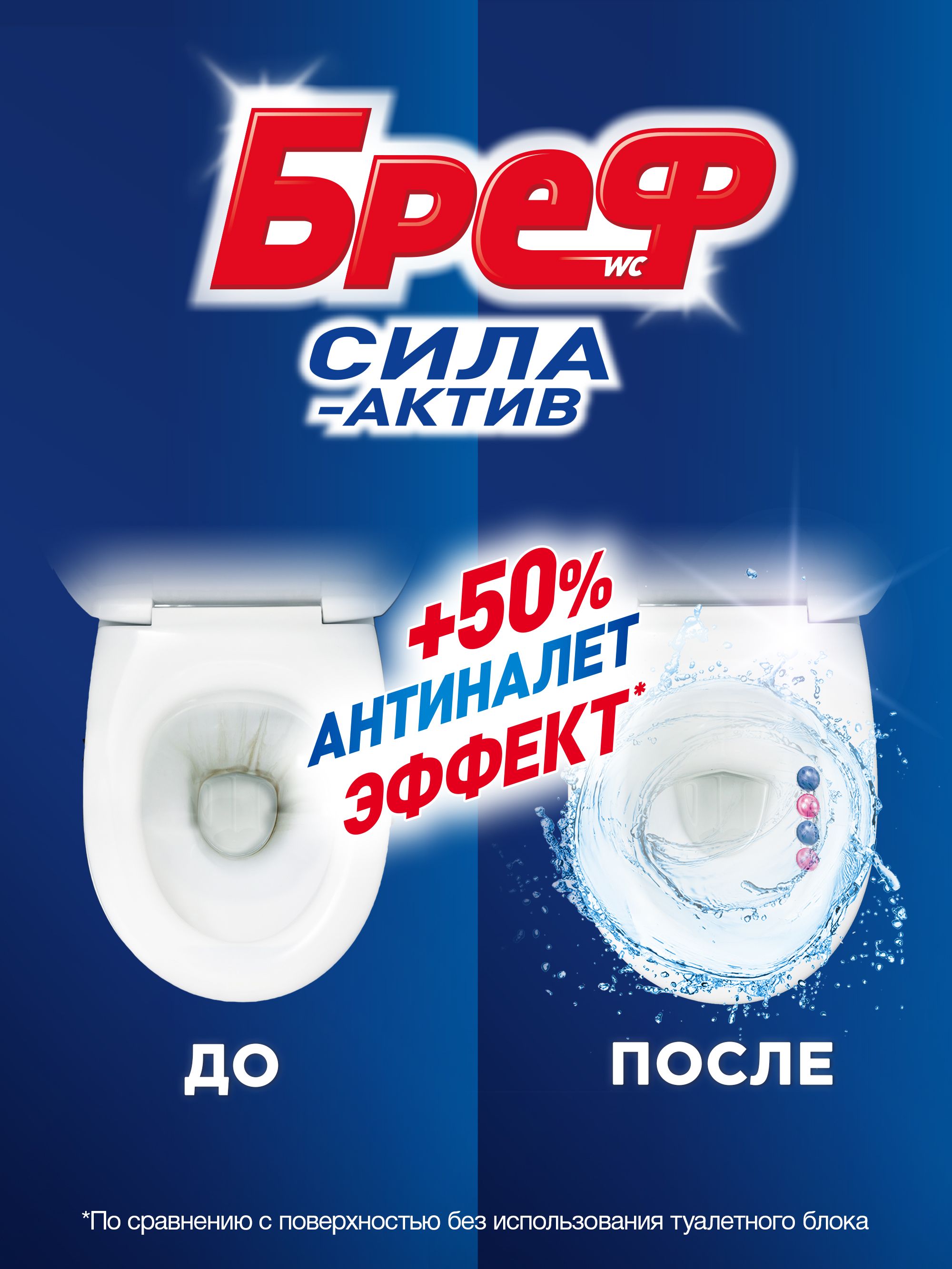Описание: Бреф Сила-Актив с АНТИНАЛЕТ ЭФФЕКТ – подвесной туалетный блок с формулой против известкового налета. Активная формула с антиналет эффектом действует в 4 направлениях: • образует очищающую пену, которая обеспечивает гигиеническую чистоту; • предотвращает образование известкового налета; • помогает предотвратить повторное загрязнение; • придает туалетной комнате свежий цветочный аромат после каждого смывания. Бреф Сила-Актив придает антиналет эффект при каждом смывании.