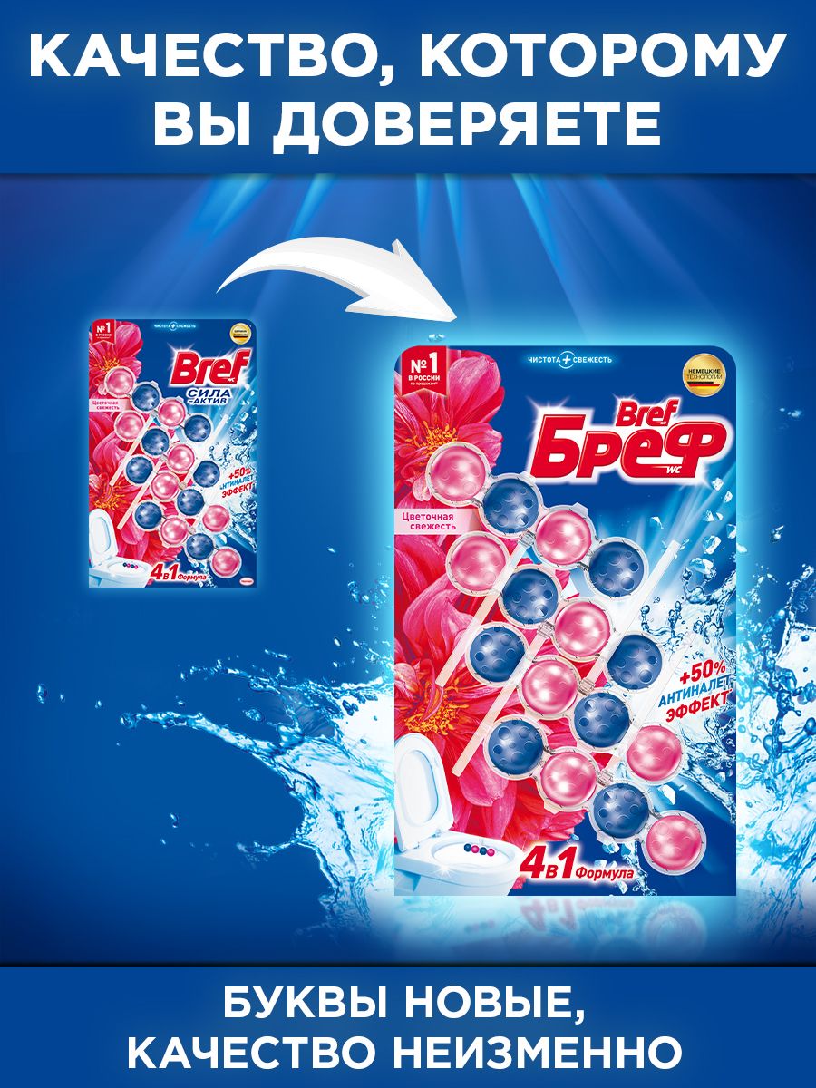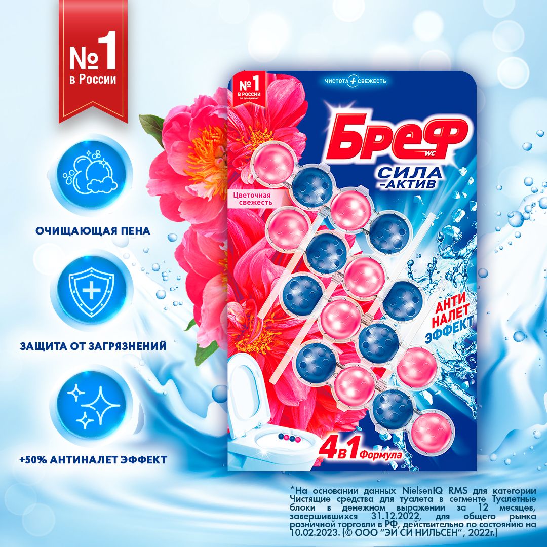 Туалетный блок Бреф Сила-Актив Цветочная свежесть в виде блока очистителя для унитаза, средство для туалета 4 блока (200г)