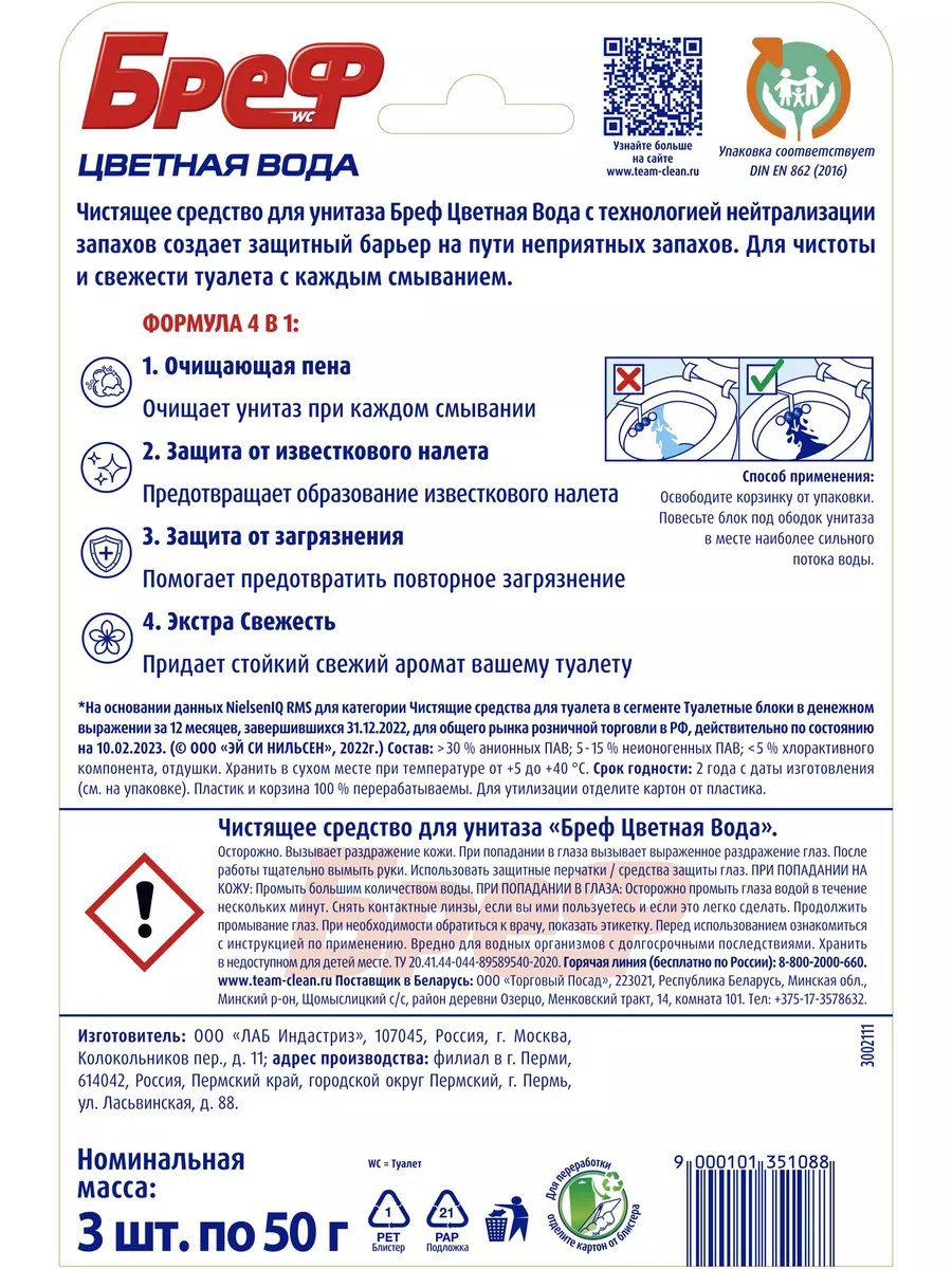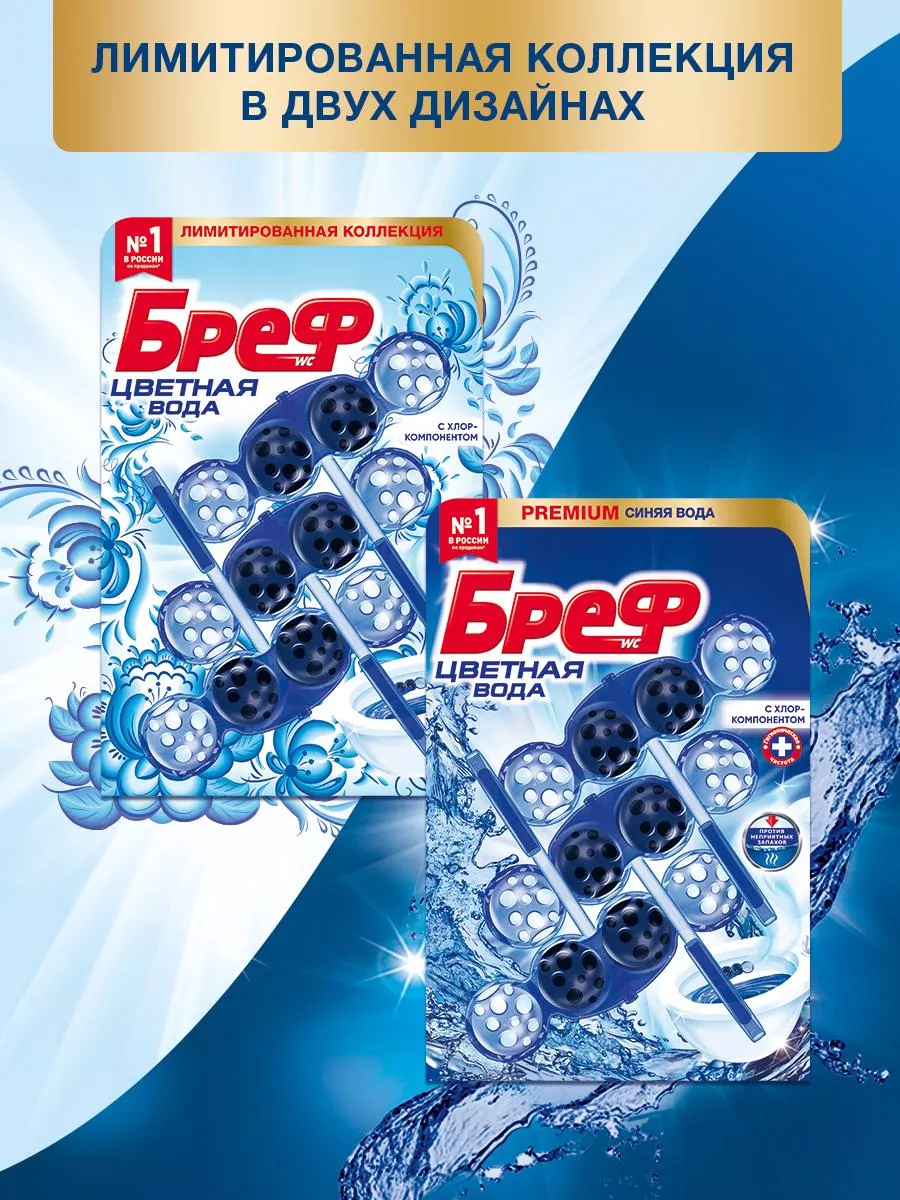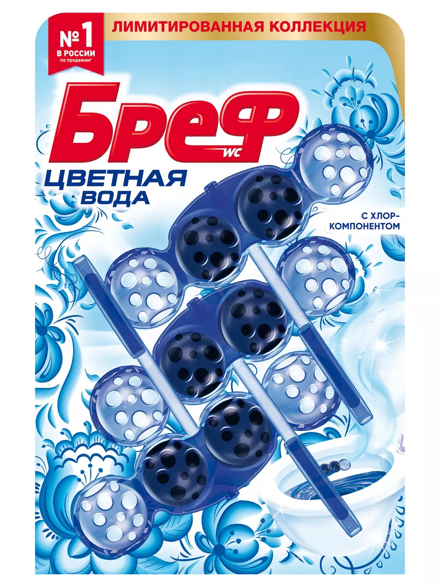 Описание: Бреф Цветная вода — подвесной туалетный блок с технологией нейтрализации запахов, которая создает защитный барьер на пути неприятных запахов. Активная формула цветной воды действует в 4 направлениях: • образует очищающую пену, которая обеспечивает гигиеническую чистоту; • предотвращает образование известкового налета; • помогает предотвратить повторное загрязнение; • придает туалетной комнате свежий цветочный аромат. Бреф Цветная вода – видимый результат при каждом смывании. Туалетный блок для унитаза Бреф Цветная вода поддерживает чистоту и свежесть Вашего туалета даже между смываниями. При смывании вода попадает в корзинку туалетного блока, где она насыщается активными ингредиентами, а через некоторое время вытекает из корзинки блока для унитаза и омывает поверхность унитаза. Доказательство эффективности - синяя вода в Вашем унитазе, которая отвечает за чистоту и свежесть даже между смываниями! Чистящим средствам для туалета и ванной комнаты Бреф по силам справиться с самыми серьезными проблемами и устранить ржавчину, известковый налет и различные загрязнения. Средства для унитаза Бреф помогут Вам поддерживать чистоту и свежесть туалета до 4 недель.