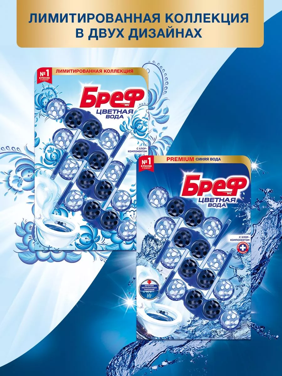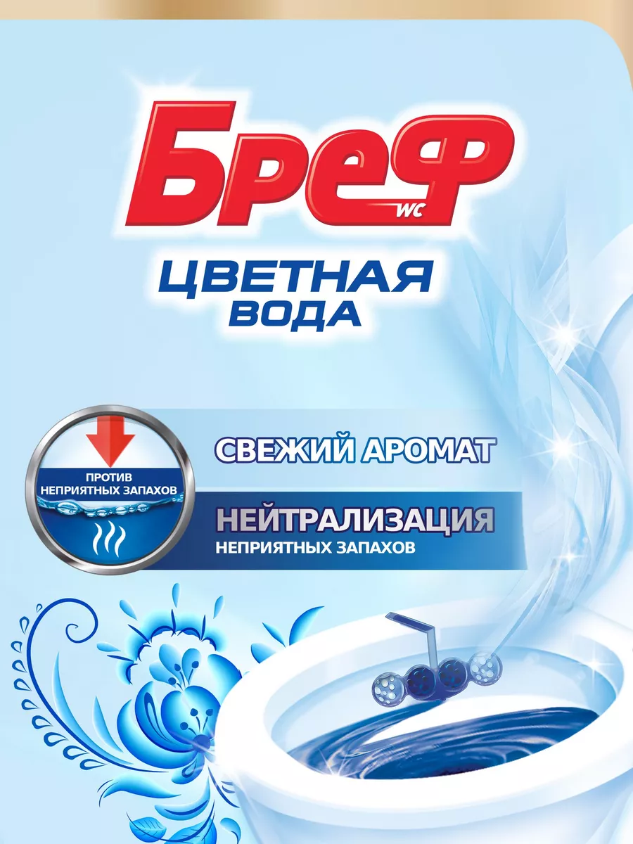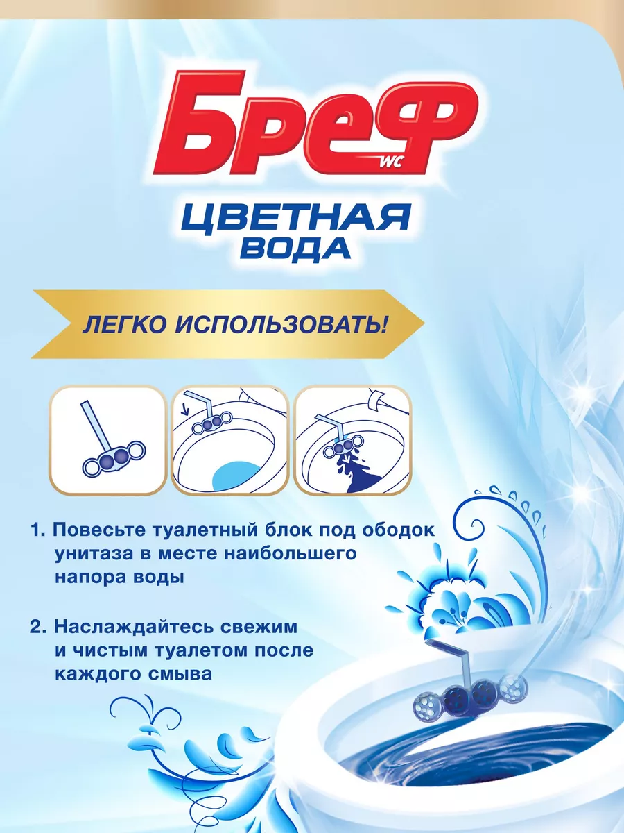 Описание: Бреф Цветная вода— подвесной туалетный блок с технологией нейтрализации запахов, которая создает защитный барьер на пути неприятных запахов. Активная формула цветной воды действует в 4 направлениях: • образует очищающую пену, которая обеспечивает гигиеническую чистоту; • предотвращает образование известкового налета; • помогает предотвратить повторное загрязнение; • придает туалетной комнате свежий аромат. Бреф Цветная вода – видимый результат при каждом смывании. Туалетный блок для унитаза Бреф Цветная вода поддерживает чистоту и свежесть Вашего туалета даже между смываниями. При смывании вода попадает в корзинку туалетного блока, где она насыщается активными ингредиентами, а через некоторое время вытекает из корзинки блока для унитаза и омывает поверхность унитаза. Доказательство эффективности - синяя вода в Вашем унитазе, которая отвечает за чистоту и свежесть даже между смываниями! Чистящим средствам для туалета и ванной комнаты Бреф по силам справиться с самыми серьезными проблемами и устранить ржавчину, известковый налет и различные загрязнения. Средства для унитаза Бреф помогут Вам поддерживать чистоту и свежесть туалета до 4 недель.