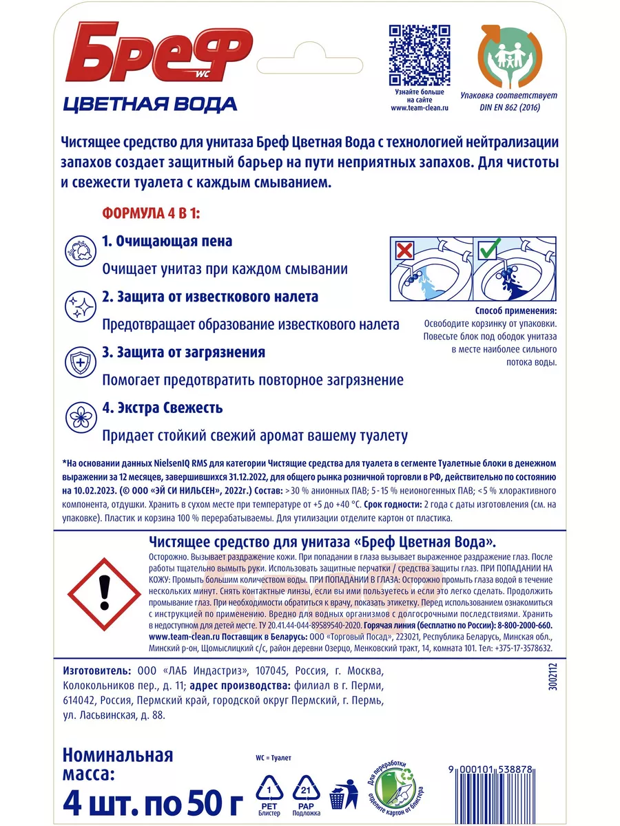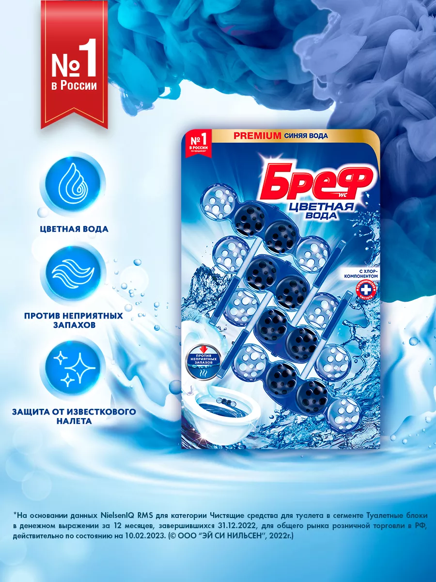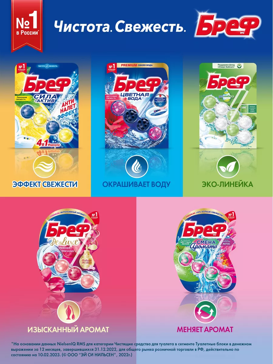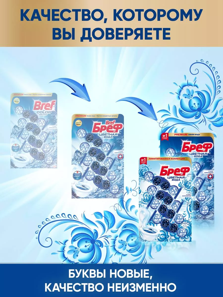 Описание: Бреф Цветная вода— подвесной туалетный блок с технологией нейтрализации запахов, которая создает защитный барьер на пути неприятных запахов. Активная формула цветной воды действует в 4 направлениях: • образует очищающую пену, которая обеспечивает гигиеническую чистоту; • предотвращает образование известкового налета; • помогает предотвратить повторное загрязнение; • придает туалетной комнате свежий аромат. Бреф Цветная вода – видимый результат при каждом смывании. Туалетный блок для унитаза Бреф Цветная вода поддерживает чистоту и свежесть Вашего туалета даже между смываниями. При смывании вода попадает в корзинку туалетного блока, где она насыщается активными ингредиентами, а через некоторое время вытекает из корзинки блока для унитаза и омывает поверхность унитаза. Доказательство эффективности - синяя вода в Вашем унитазе, которая отвечает за чистоту и свежесть даже между смываниями! Чистящим средствам для туалета и ванной комнаты Бреф по силам справиться с самыми серьезными проблемами и устранить ржавчину, известковый налет и различные загрязнения. Средства для унитаза Бреф помогут Вам поддерживать чистоту и свежесть туалета до 4 недель.
