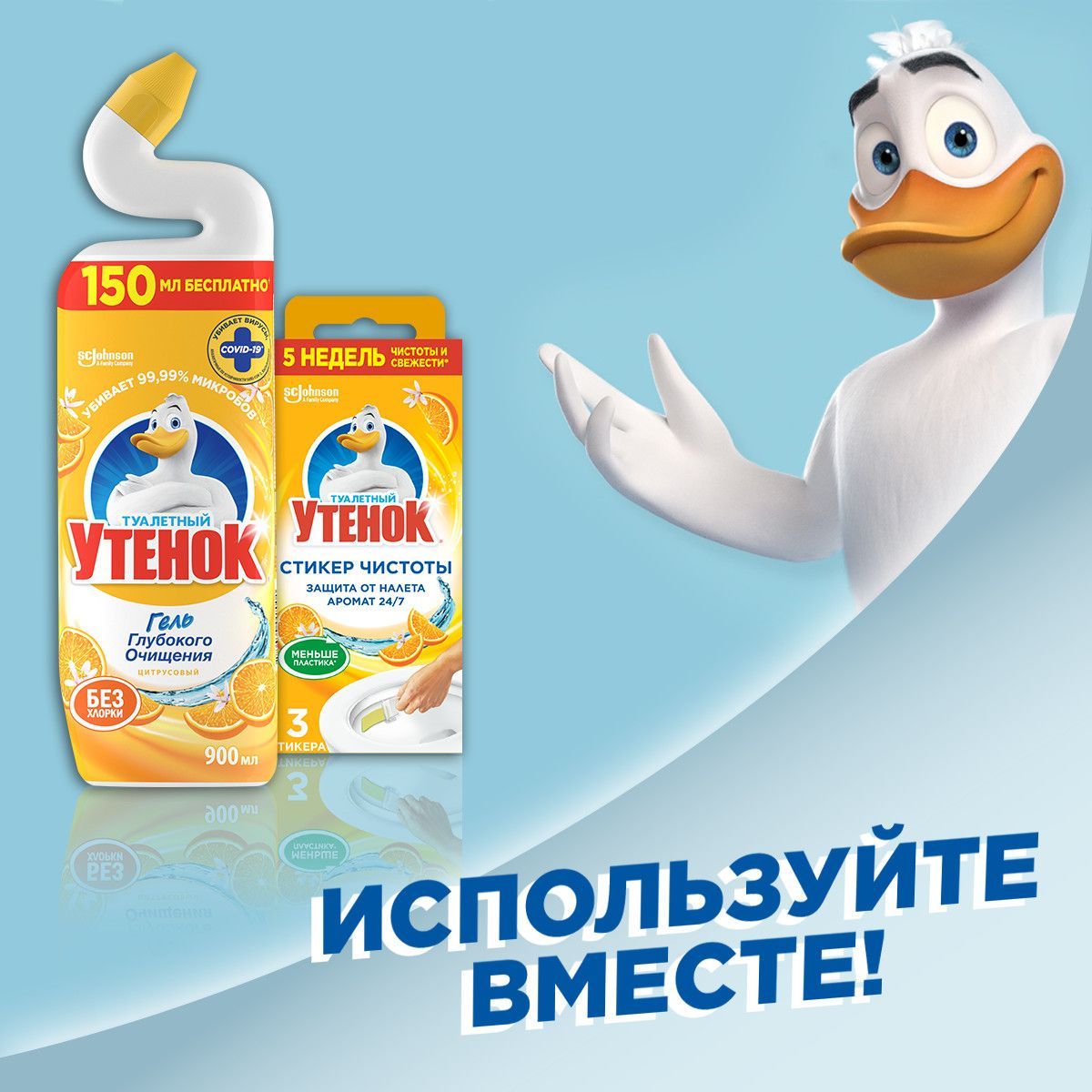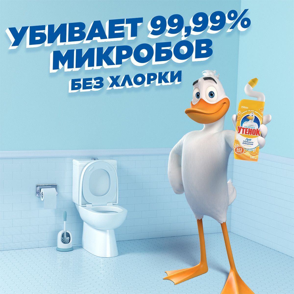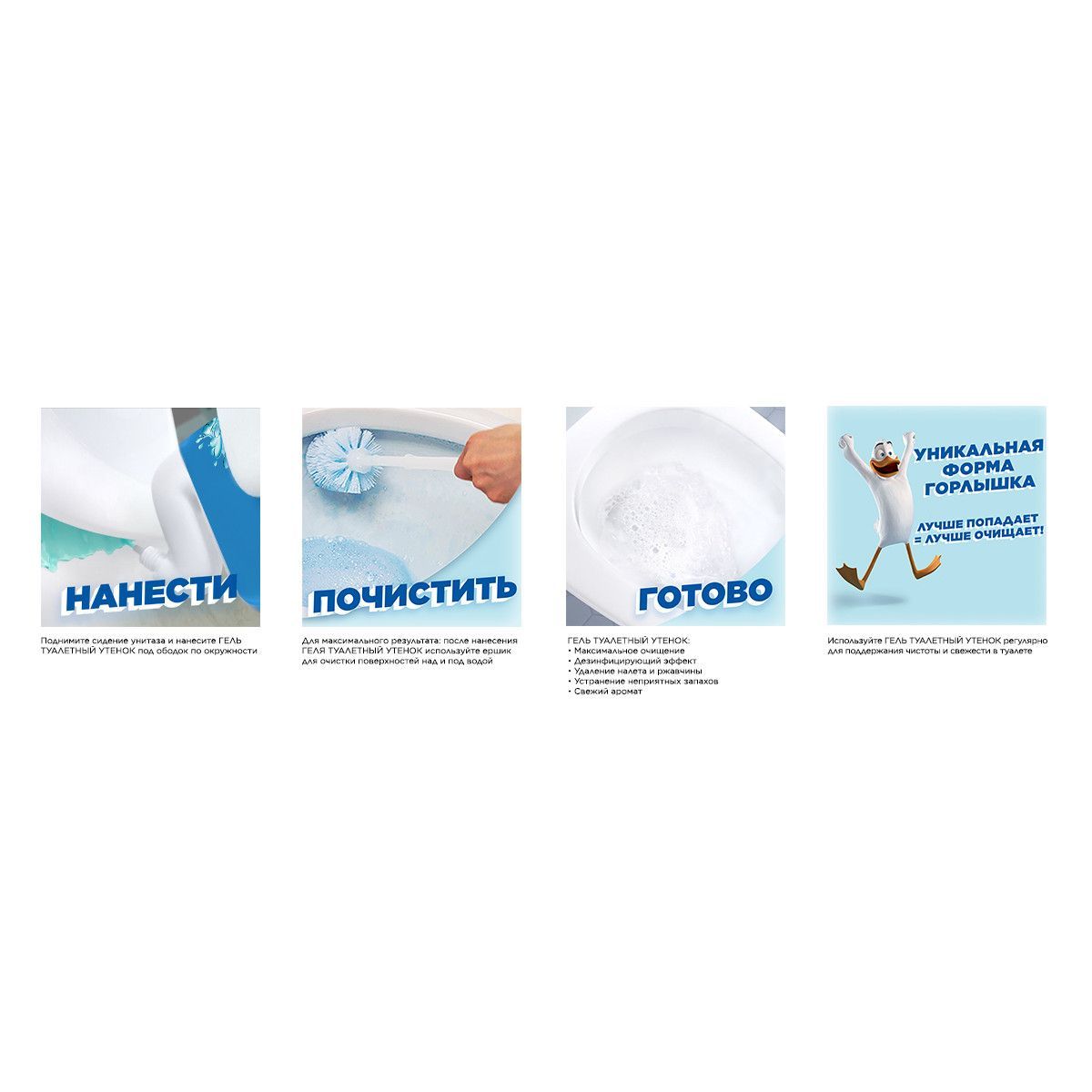 Описание: Супер эффективная формула чистящего средства для унитаза Туалетный Утенок справляется с самыми сложными проблемами: удаляет стойкие пятна, включая ржавчину и до 100% известкового налета, УБИВАЕТ 99,9% МИКРОБОВ и эффективен даже под водой. Благодаря уникальной форме горлышка бутылки лучше попадает в труднодоступные места скопления бактерий под ободком унитаза. Моющее (чистящее) средство для унитаза (туалета) аналог Domestos (Доместос), Bref (Бреф), Grass (Грасс), бытовая химия