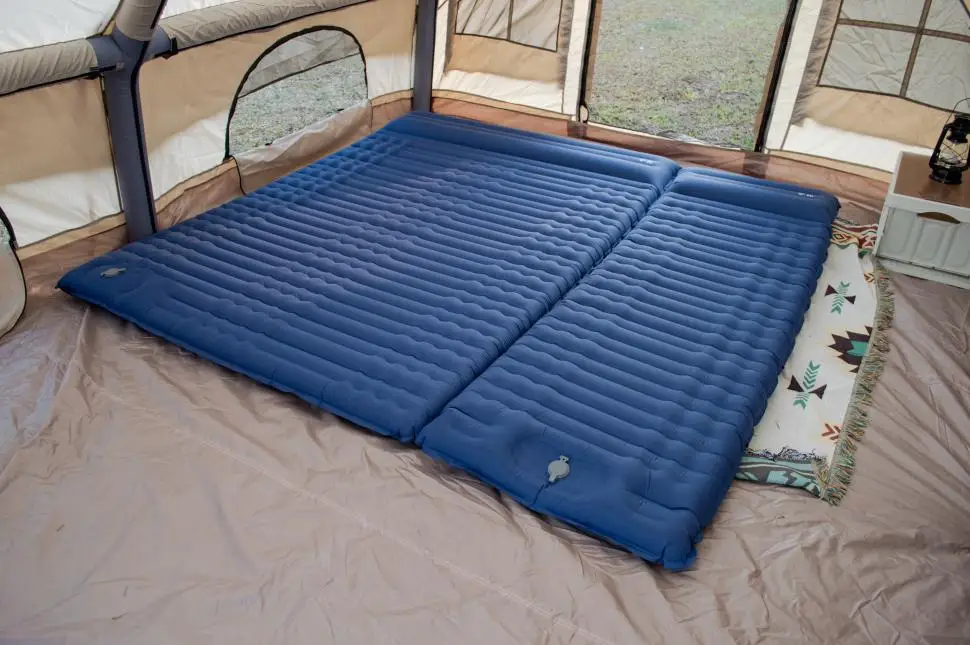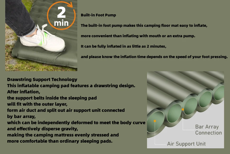 2. Сверхлегкий спальный коврик использует уникальную технологию поддержки шнурка. Блок воздушной поддержки может быть самостоятельно деформирован, чтобы соответствовать изгибам тела и эффективно рассеивать гравитацию, увеличивая весоустойчивость надувной спальной площадки до 800 фунтов. Плюс эргономичная цельная подушка, этот спальный коврик для кемпинга гораздо удобнее, чем другие, и подарит вам максимальный комфорт.
