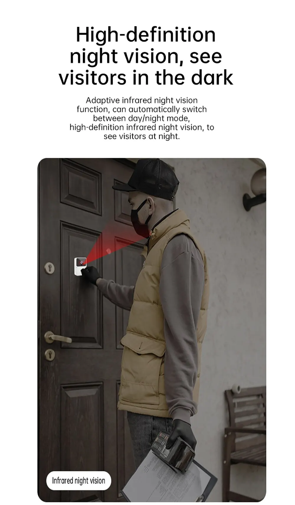 Видеозвонок: легко обращаться с гостями, когда кто-то нажимает на дверной звонок, дверной звонок отправляет уведомление на телефон, и владелец может войти в интерфейс видеосвязи телефона.
