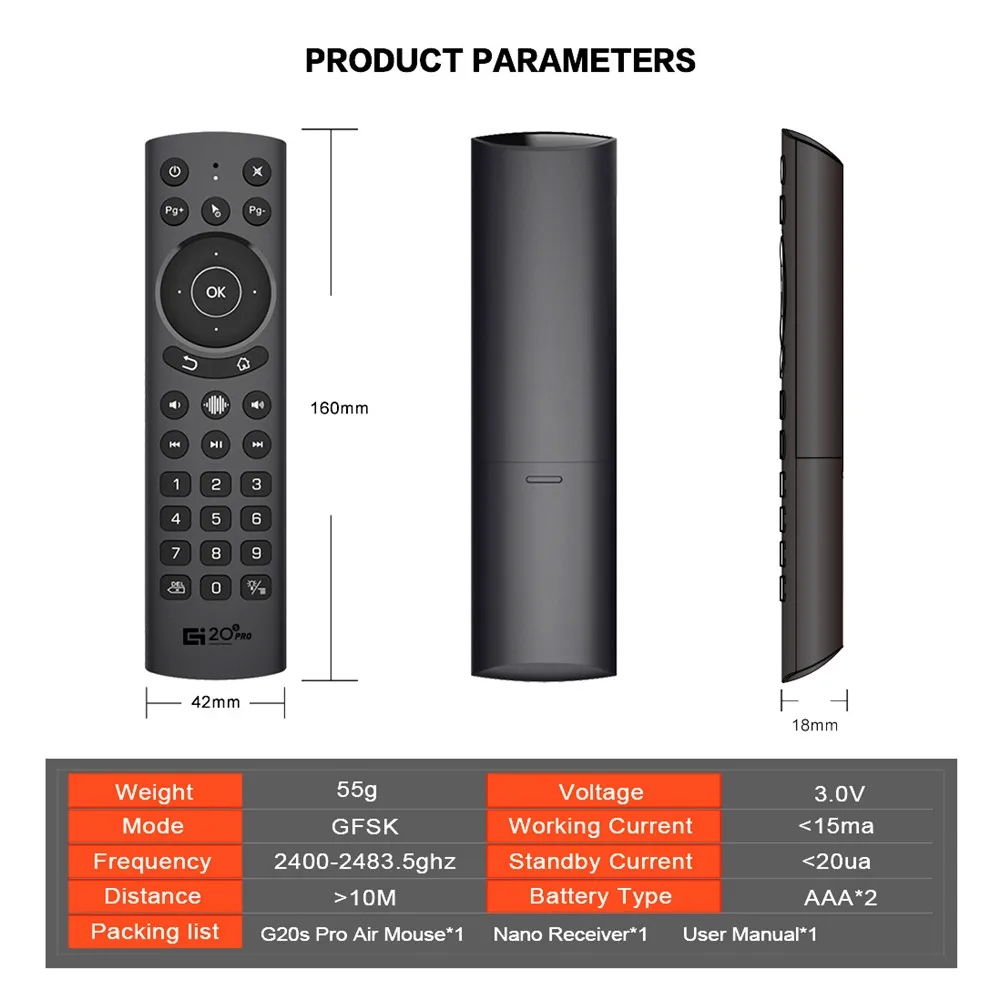 Если вы выберете ТВ-бокс с G20SPRO, в ваш пакет будет входить голосовой пульт дистанционного управления, как показано ниже: