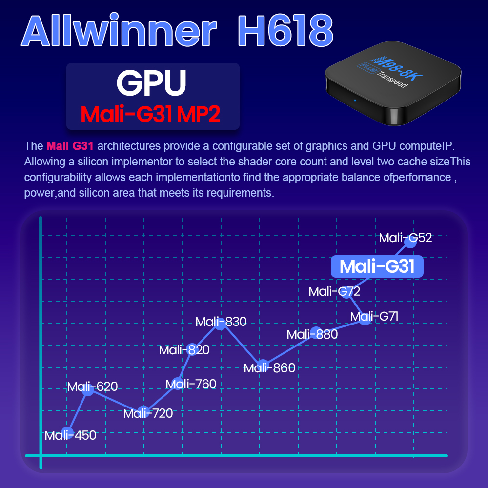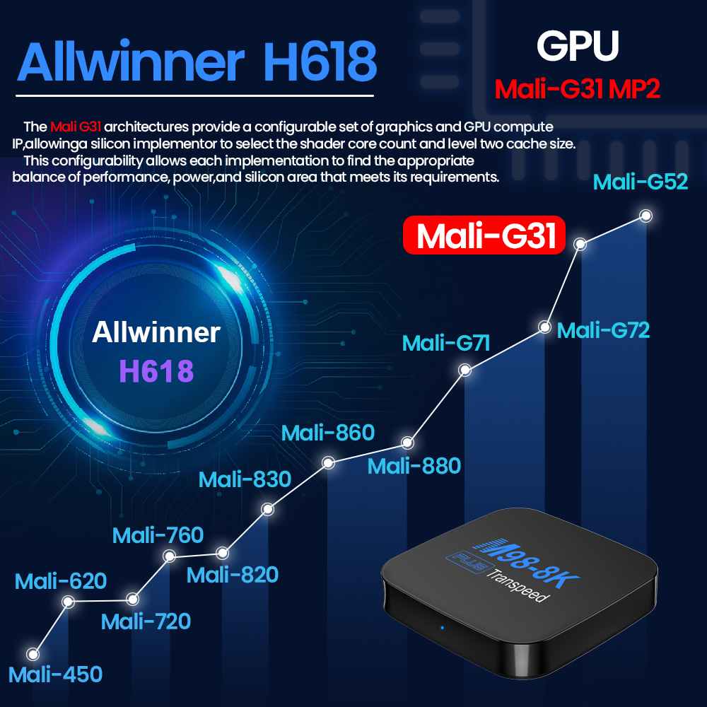 ЦП Allwinner H618 GPU Mali-G31 MP2Allwinner H618Destktop ОС ATV, Fsat и удобный с приложениями версии ТВHDR10 + Более четкое изображение в любых условиях освещенияКачество изображения 4K Ultra HD Более детальное и яркое изображениеДекодирование видео 8K Плавное воспроизведение видео 8k