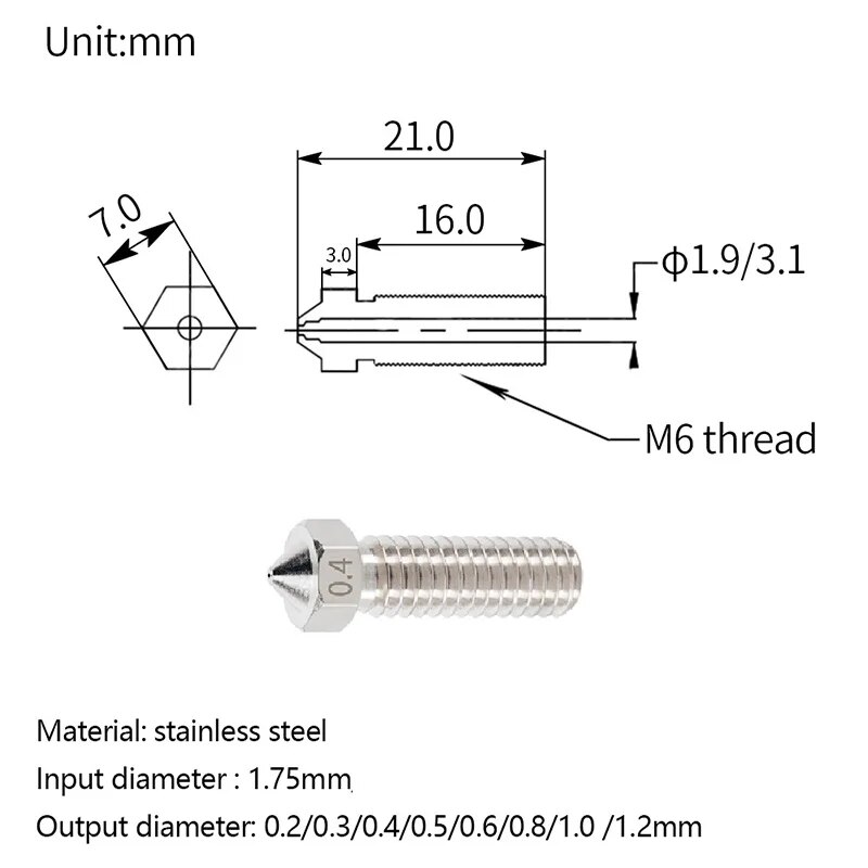 1. Сопло вулкана из нержавеющей стали: импортный медный материал, равномерное прядение, увеличение скорости плавления и скорость печати