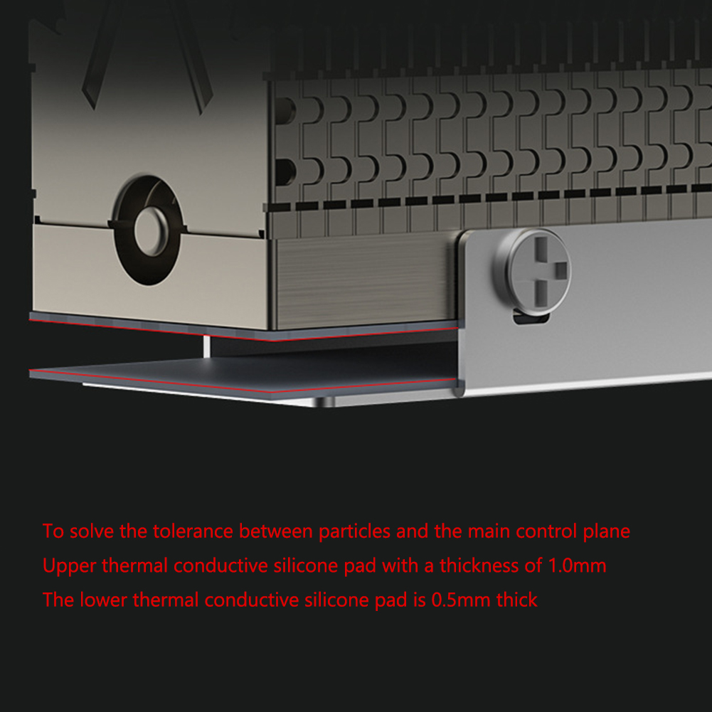 2. Эффективное рассеивание тепла: Структура пассивного ребра в сочетании с двусторонней силиконовой пленкой 14,8 Вт/K обеспечивает максимальное рассеивание тепла. Прокладки теплопроводности толщиной 1,0 мм и 0,5 мм используются для решения проблем допуска частиц и плоскости контроллера.
