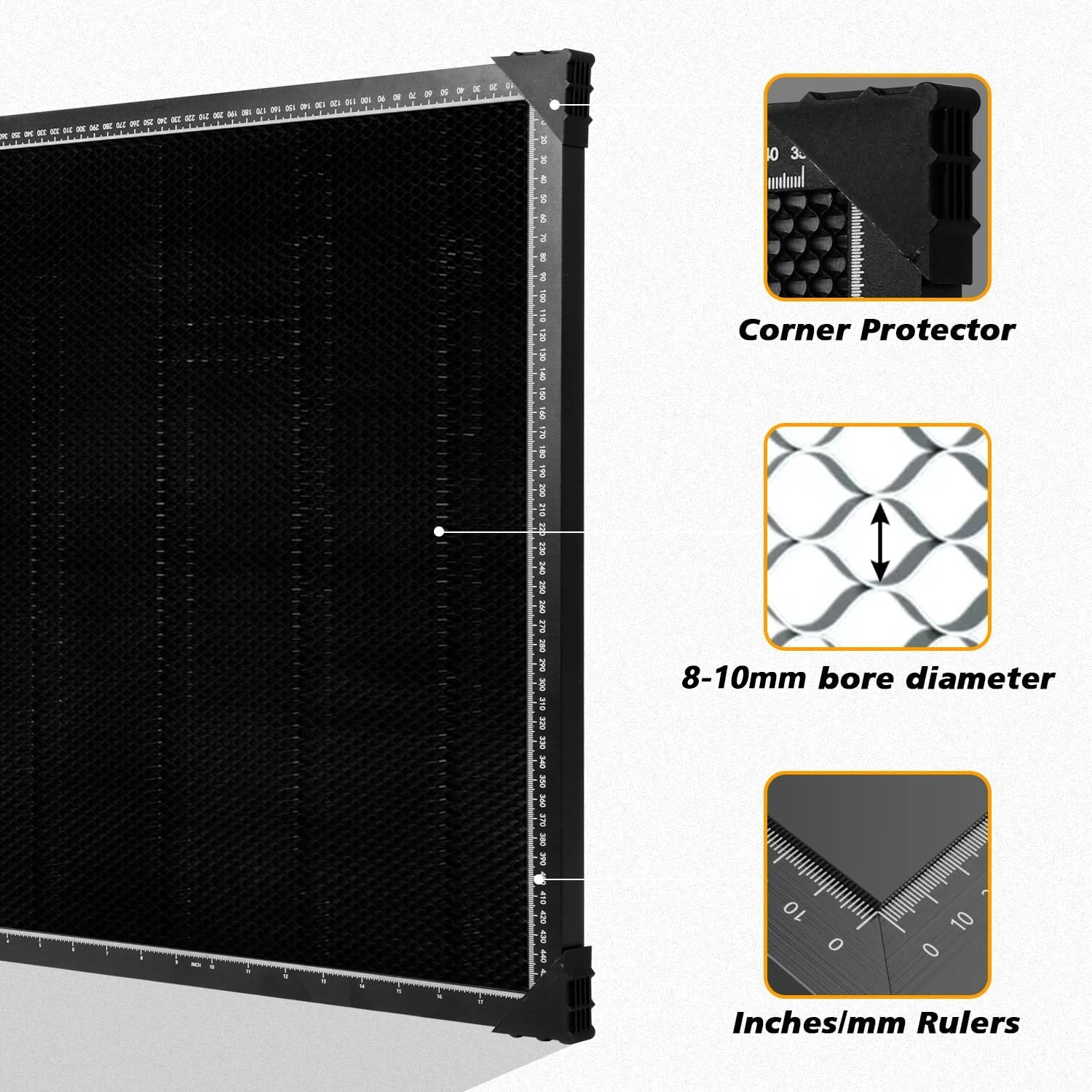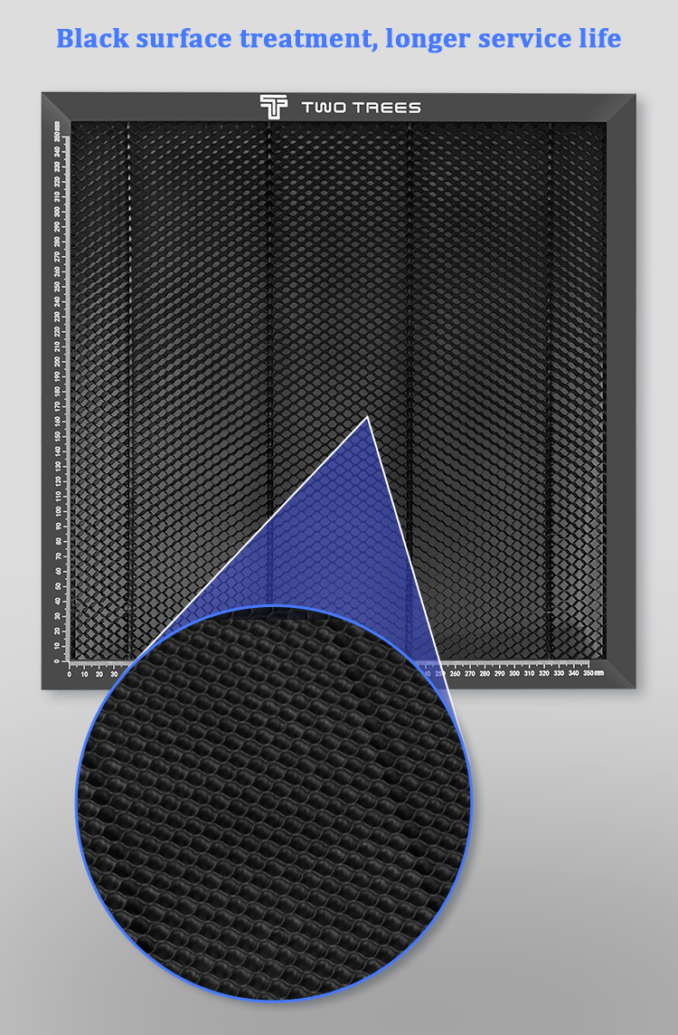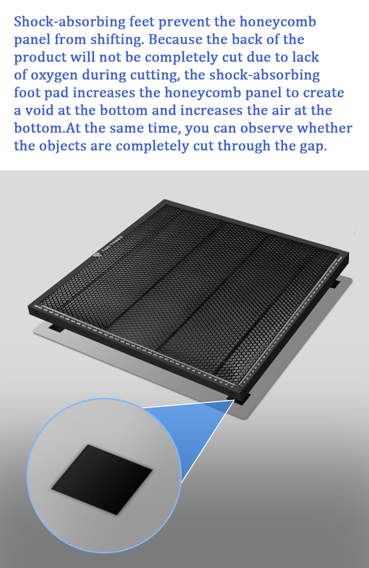 Рамка панели сота сделана из облегченного но крепкого алюминия, и поверхность продукта обработана с черной краской брызга, так, что рустпрооф, теплостойкий, ссадин-устойчив, и прочный. Сотовый узор на кровати предотвращает повреждение лазерной головки отражением лазера, продлевая срок ее службы и защищая ваши глаза.