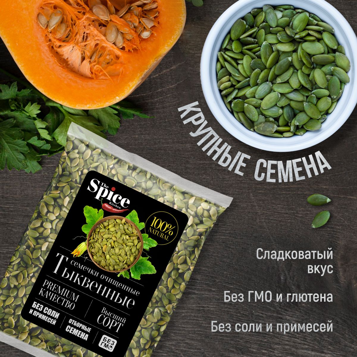 Описание: Тыквенные семечки могут похвастаться богатым витаминно-минеральным составом. Они содержат витамины (А, В, С, К, D, Е), минералы (кальций, селен, цинк, магний, медь, калий, железо, марганец и фосфор), некоторые аминокислоты, например глутаминовую, линоленовую и аргинин, а также жирные растительные кислоты. Всего тыквенные семечки содержат 12 незаменимых и восемь заменимых аминокислот. Содержание фосфора и магния в 100 г продукта способно удовлетворить суточную потребность на 150%, содержание марганца превышает суточную норму в два раза. Страна происхождения семян тыквы: Россия. Свойства тыквенных семечек: Нормализация сна и предупреждение развития депрессии. В состав тыквенных семечек входит полезная для человека аминокислота L-триптофан, регулярное употребление которой способно повысить качество и продолжительность фазы глубокого сна. Попадая в организм, она преобразуется в ниацин и серотонин (а все мы знаем, что серотонин – это источник хорошего настроения), от которых напрямую зависит не только сон, но и эмоциональное состояние человека. Вещества, входящие в состав семян тыквы, положительно влияют на работу нервной системы, улучшают когнитивные функции организма, такие как память, и быстроту усваивания новой информации. Тыквенные семечки – отличный источник магния, который также влияет на качество сна Профилактика сердечно-сосудистых заболеваний. Другая важная аминокислота, содержащаяся в семенах тыквы, называется аргинин. Эта аминокислота в организме трансформируется в окись азота, контролируя расширение артерий и сосудов, тем самым улучшая ток крови по ним. Витамин A в составе семян предупреждает развитие стенокардии и облегчает течение этого заболевания Снижение уровня «плохого» холестерина. Регулярное употребление тыквенных семечек помогает снизить уровень «плохого» холестерина в крови и предупредить развитие атеросклероза (поражения стенок кровеносных сосудов, которое может повлечь за собой риски развития тяжелых сердечно-сосудистых заболеваний). Это объясняется фитостеролом в составе Профилактика остеопороза. Благодаря высокому содержанию цинка семена тыквы помогают улучшить состояние костей в любом возрасте, а еще укрепляют сосуды и уменьшают воспаления при артритах Помощь в работе ЖКТ. За счет высокого содержания клетчатки семена тыквы нормализуют работу кишечника, стимулируя перистальтику и тем самым очищая его, словно щетка. Также употребление тыквенных семян может избавить от приступов тошноты, связанных с морской болезнью или токсикозом Улучшение зрения. Регулярное включение в свой рацион тыквенных семян помогает улучшать сумеречное зрение и цветовое восприятие, а все это благодаря витамину А, который принимает непосредственное участие в выработке зрительного пигмента сетчатки под названием «родопсин». Магний, калий, железо, кальций и клетчатка также необходимы для нормального функционирования зрительной системы, они помогают поддерживать сетчатку глаз в хорошем состоянии и предупреждают развитие катаракты. Польза: Тыквенные семечки содержат витамины А и Е, которые отвечают за сохранение упругости и гладкости кожи, укрепление ногтей, препятствуют формированию морщин и помогают надолго сохранить молодость. Жирные кислоты в составе семян увлажняют кожу изнутри, препятствуя 