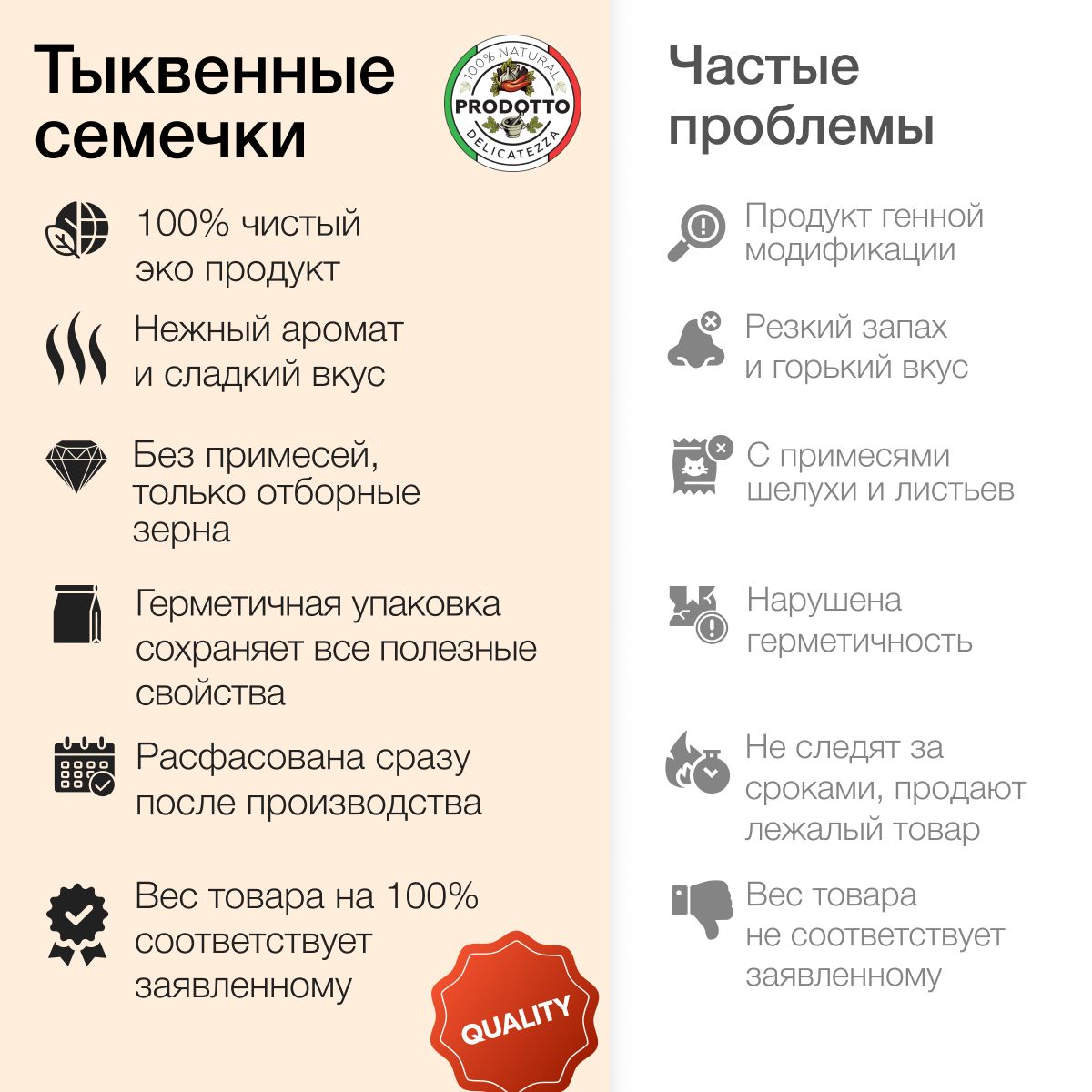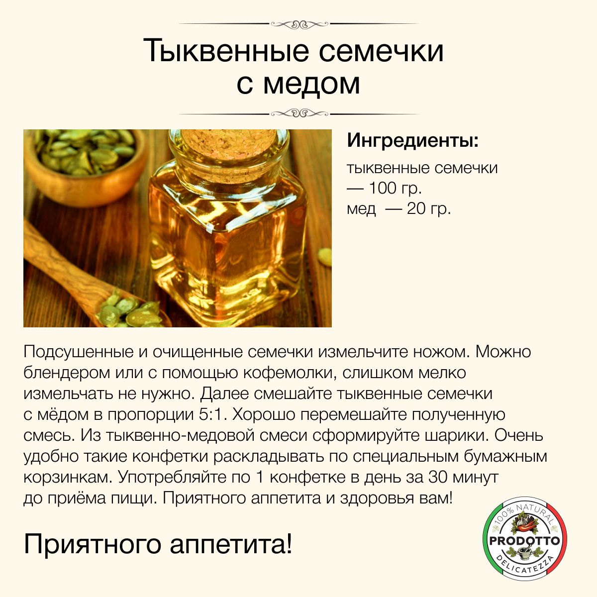 Описание: Тыквенные семечки могут похвастаться богатым витаминно-минеральным составом. Они содержат витамины (А, В, С, К, D, Е), минералы (кальций, селен, цинк, магний, медь, калий, железо, марганец и фосфор), некоторые аминокислоты, например глутаминовую, линоленовую и аргинин, а также жирные растительные кислоты. Всего тыквенные семечки содержат 12 незаменимых и восемь заменимых аминокислот. Содержание фосфора и магния в 100 г продукта способно удовлетворить суточную потребность на 150%, содержание марганца превышает суточную норму в два раза. Страна происхождения семян тыквы: Россия. Свойства тыквенных семечек: Нормализация сна и предупреждение развития депрессии. В состав тыквенных семечек входит полезная для человека аминокислота L-триптофан, регулярное употребление которой способно повысить качество и продолжительность фазы глубокого сна. Попадая в организм, она преобразуется в ниацин и серотонин (а все мы знаем, что серотонин – это источник хорошего настроения), от которых напрямую зависит не только сон, но и эмоциональное состояние человека. Вещества, входящие в состав семян тыквы, положительно влияют на работу нервной системы, улучшают когнитивные функции организма, такие как память, и быстроту усваивания новой информации. Тыквенные семечки – отличный источник магния, который также влияет на качество сна Профилактика сердечно-сосудистых заболеваний. Другая важная аминокислота, содержащаяся в семенах тыквы, называется аргинин. Эта аминокислота в организме трансформируется в окись азота, контролируя расширение артерий и сосудов, тем самым улучшая ток крови по ним. Витамин A в составе семян предупреждает развитие стенокардии и облегчает течение этого заболевания Снижение уровня «плохого» холестерина. Регулярное употребление тыквенных семечек помогает снизить уровень «плохого» холестерина в крови и предупредить развитие атеросклероза (поражения стенок кровеносных сосудов, которое может повлечь за собой риски развития тяжелых сердечно-сосудистых заболеваний). Это объясняется фитостеролом в составе Профилактика остеопороза. Благодаря высокому содержанию цинка семена тыквы помогают улучшить состояние костей в любом возрасте, а еще укрепляют сосуды и уменьшают воспаления при артритах Помощь в работе ЖКТ. За счет высокого содержания клетчатки семена тыквы нормализуют работу кишечника, стимулируя перистальтику и тем самым очищая его, словно щетка. Также употребление тыквенных семян может избавить от приступов тошноты, связанных с морской болезнью или токсикозом Улучшение зрения. Регулярное включение в свой рацион тыквенных семян помогает улучшать сумеречное зрение и цветовое восприятие, а все это благодаря витамину А, который принимает непосредственное участие в выработке зрительного пигмента сетчатки под названием «родопсин». Магний, калий, железо, кальций и клетчатка также необходимы для нормального функционирования зрительной системы, они помогают поддерживать сетчатку глаз в хорошем состоянии и предупреждают развитие катаракты. Польза: Тыквенные семечки содержат витамины А и Е, которые отвечают за сохранение упругости и гладкости кожи, укрепление ногтей, препятствуют формированию морщин и помогают надолго сохранить молодость. Жирные кислоты в составе семян увлажняют кожу изнутри, препятствуя 