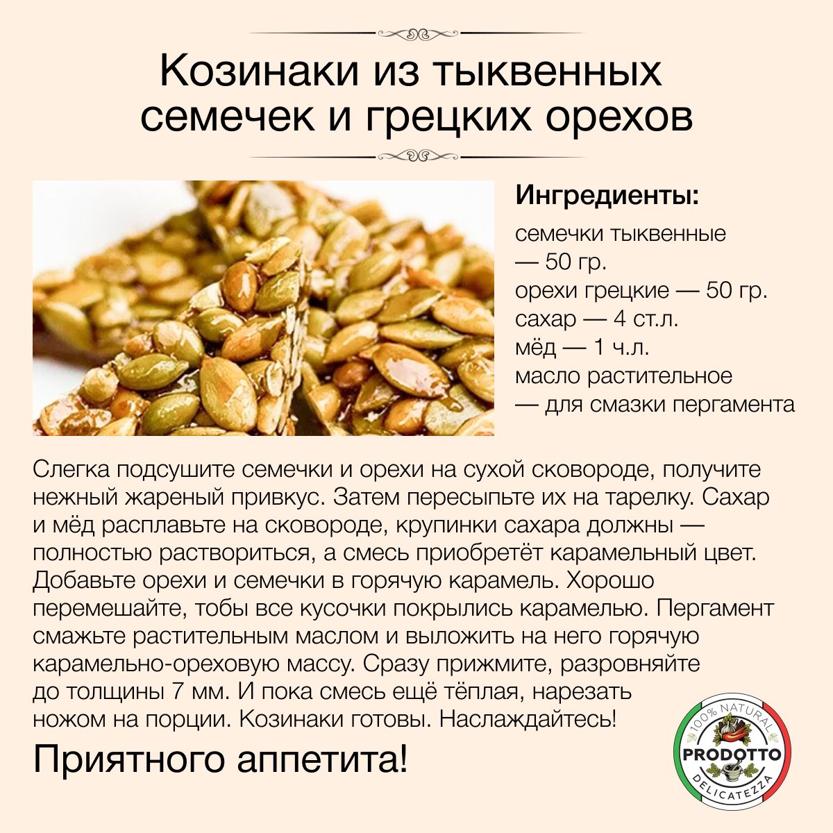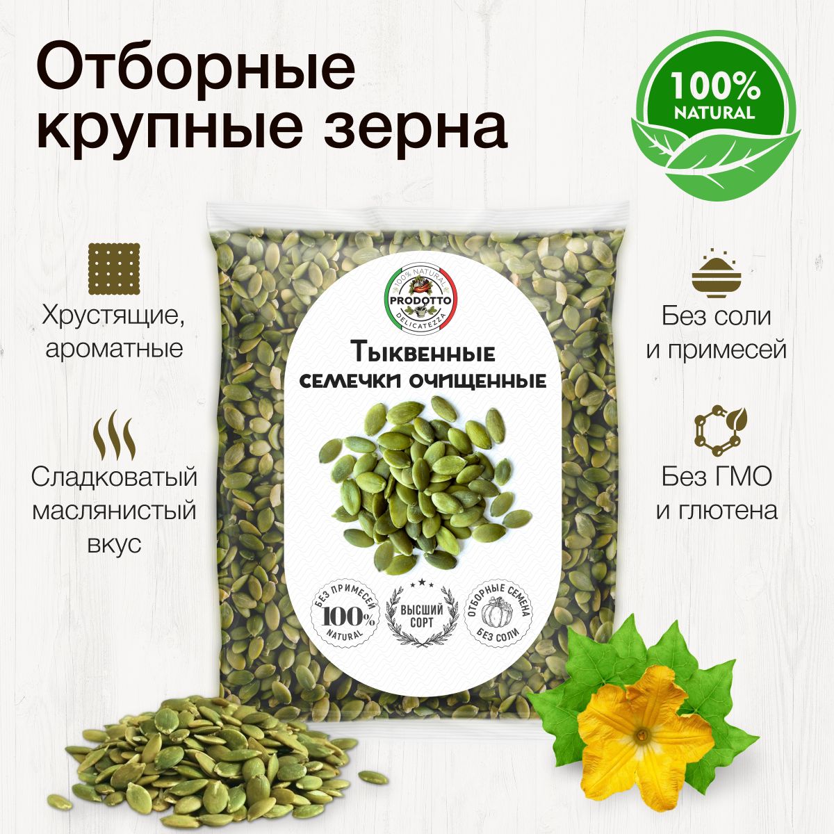Описание: Тыквенные семечки могут похвастаться богатым витаминно-минеральным составом. Они содержат витамины (А, В, С, К, D, Е), минералы (кальций, селен, цинк, магний, медь, калий, железо, марганец и фосфор), некоторые аминокислоты, например глутаминовую, линоленовую и аргинин, а также жирные растительные кислоты. Всего тыквенные семечки содержат 12 незаменимых и восемь заменимых аминокислот. Содержание фосфора и магния в 100 г продукта способно удовлетворить суточную потребность на 150%, содержание марганца превышает суточную норму в два раза. Страна происхождения семян тыквы: Россия. Свойства тыквенных семечек: Нормализация сна и предупреждение развития депрессии. В состав тыквенных семечек входит полезная для человека аминокислота L-триптофан, регулярное употребление которой способно повысить качество и продолжительность фазы глубокого сна. Попадая в организм, она преобразуется в ниацин и серотонин (а все мы знаем, что серотонин – это источник хорошего настроения), от которых напрямую зависит не только сон, но и эмоциональное состояние человека. Вещества, входящие в состав семян тыквы, положительно влияют на работу нервной системы, улучшают когнитивные функции организма, такие как память, и быстроту усваивания новой информации. Тыквенные семечки – отличный источник магния, который также влияет на качество сна Профилактика сердечно-сосудистых заболеваний. Другая важная аминокислота, содержащаяся в семенах тыквы, называется аргинин. Эта аминокислота в организме трансформируется в окись азота, контролируя расширение артерий и сосудов, тем самым улучшая ток крови по ним. Витамин A в составе семян предупреждает развитие стенокардии и облегчает течение этого заболевания Снижение уровня «плохого» холестерина. Регулярное употребление тыквенных семечек помогает снизить уровень «плохого» холестерина в крови и предупредить развитие атеросклероза (поражения стенок кровеносных сосудов, которое может повлечь за собой риски развития тяжелых сердечно-сосудистых заболеваний). Это объясняется фитостеролом в составе Профилактика остеопороза. Благодаря высокому содержанию цинка семена тыквы помогают улучшить состояние костей в любом возрасте, а еще укрепляют сосуды и уменьшают воспаления при артритах Помощь в работе ЖКТ. За счет высокого содержания клетчатки семена тыквы нормализуют работу кишечника, стимулируя перистальтику и тем самым очищая его, словно щетка. Также употребление тыквенных семян может избавить от приступов тошноты, связанных с морской болезнью или токсикозом Улучшение зрения. Регулярное включение в свой рацион тыквенных семян помогает улучшать сумеречное зрение и цветовое восприятие, а все это благодаря витамину А, который принимает непосредственное участие в выработке зрительного пигмента сетчатки под названием «родопсин». Магний, калий, железо, кальций и клетчатка также необходимы для нормального функционирования зрительной системы, они помогают поддерживать сетчатку глаз в хорошем состоянии и предупреждают развитие катаракты. Польза: Тыквенные семечки содержат витамины А и Е, которые отвечают за сохранение упругости и гладкости кожи, укрепление ногтей, препятствуют формированию морщин и помогают надолго сохранить молодость. Жирные кислоты в составе семян увлажняют кожу изнутри, препятствуя 