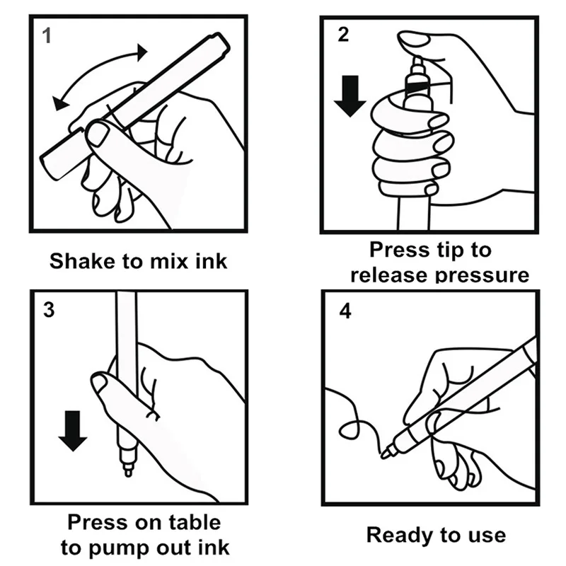 1. Ручка для рисования относится к маркировочной ручке клапанного типа. Перед использованием новой ручки корпус ручки необходимо несколько раз встряхнуть, чтобы равномерно перемешать Чернила внутри трубки.