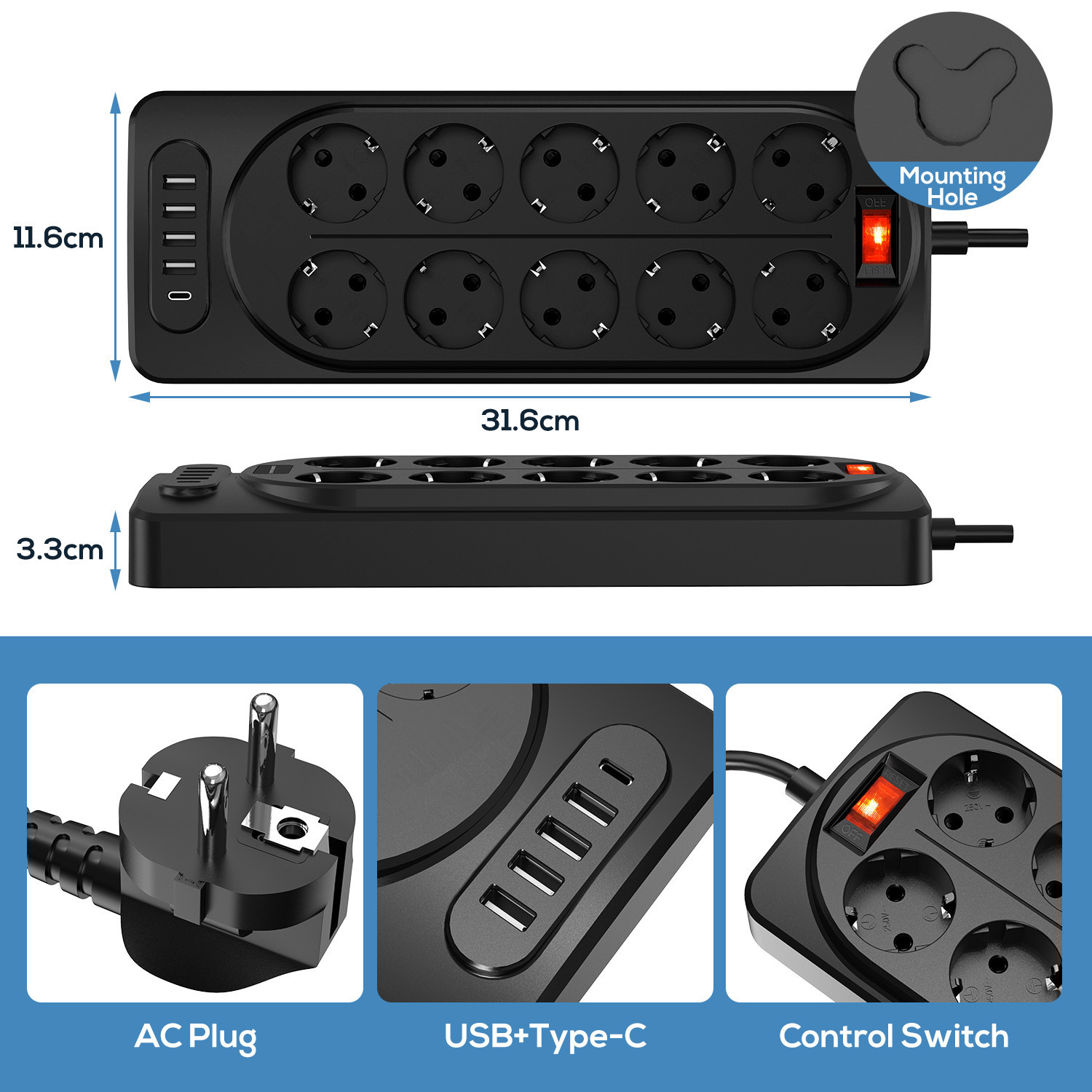 ★10 розеток питания + 4 USB + Тип C: оснащен 10 розетками питания и 4 USB, подходит для зарядки смартфонов, планшетов, настольных ламп, компьютеров и других устройств одновременно, идеально подходит для дома, офиса, в мастерской u.v. М.