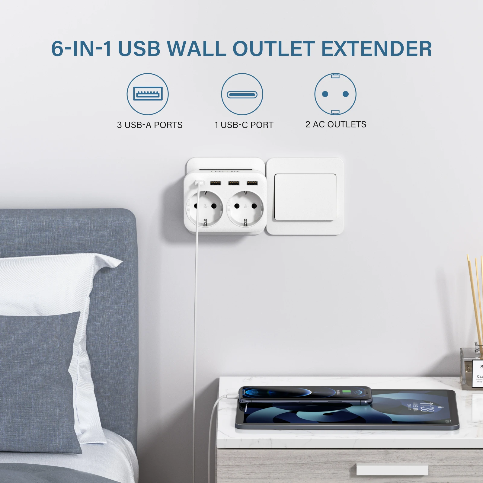 Удлинитель настенный LENCEN с 2 розетками переменного тока, 3 USB и 1 портом 5 В, а