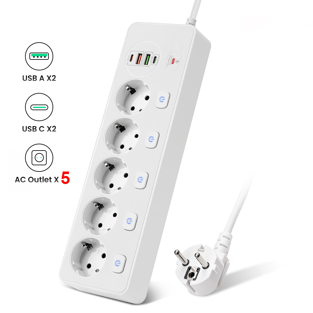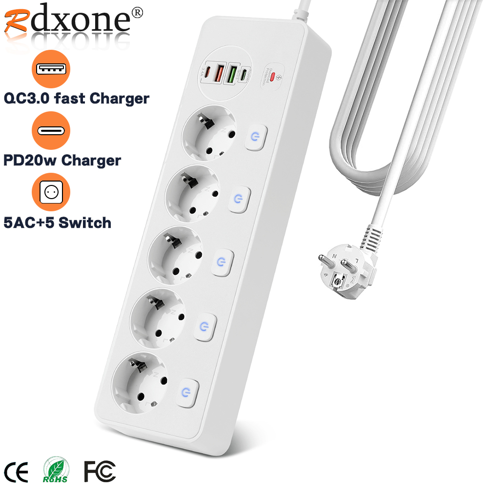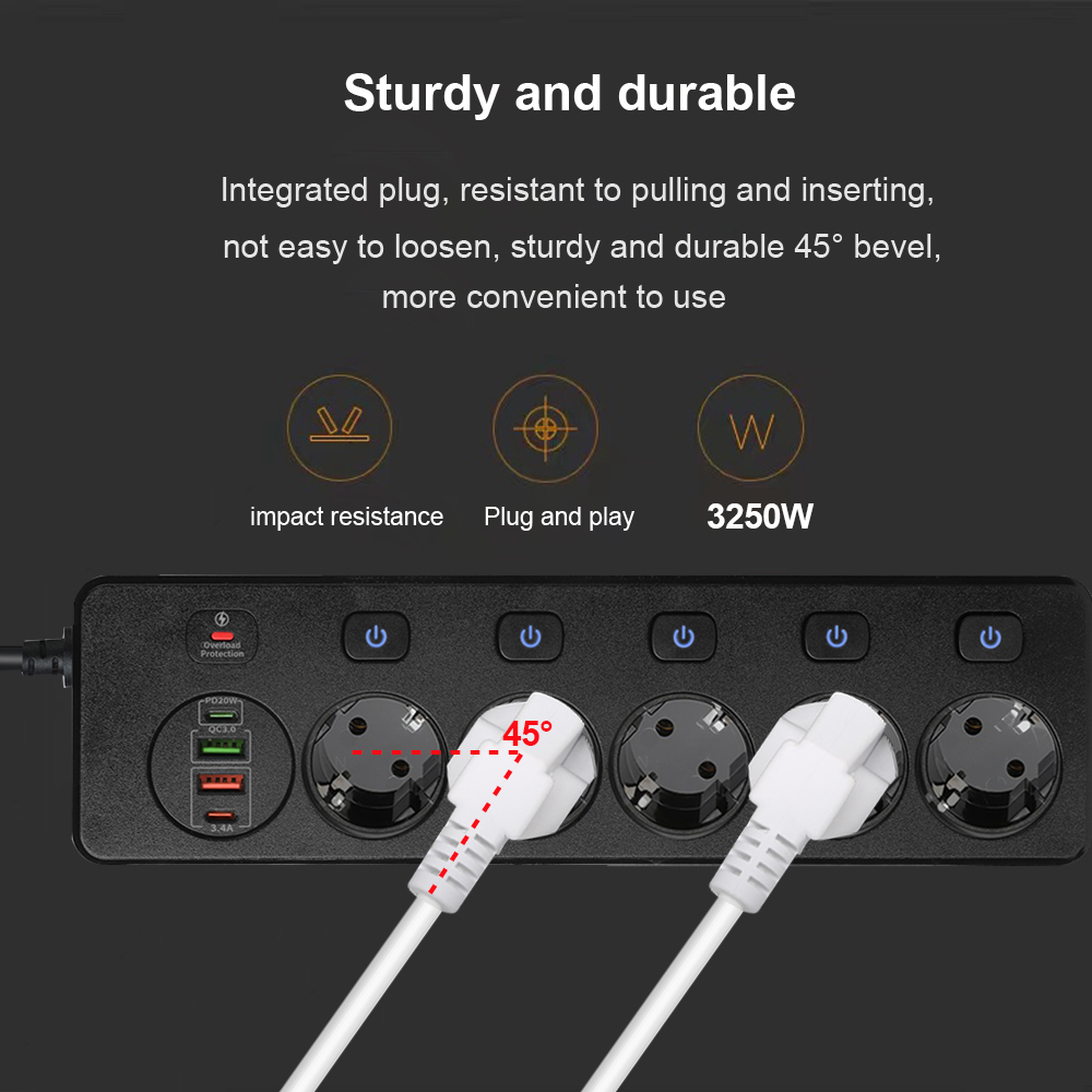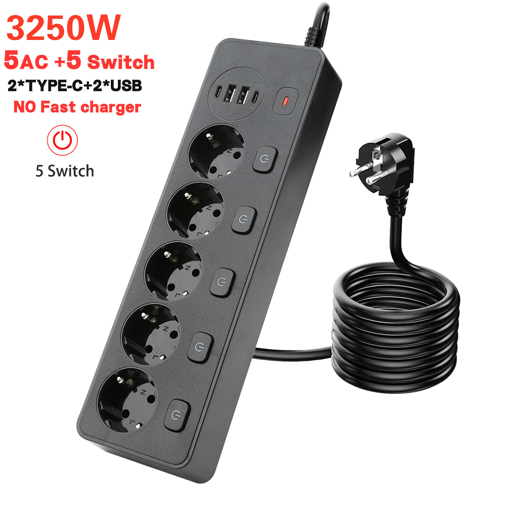 3250 Защита от перегрузки удлинителя с 5 розетками, 5 переключателей, 4 порта USB, быстрое зарядное устройство, многоцелевой индивидуальный переключатель сетевого фильтра.