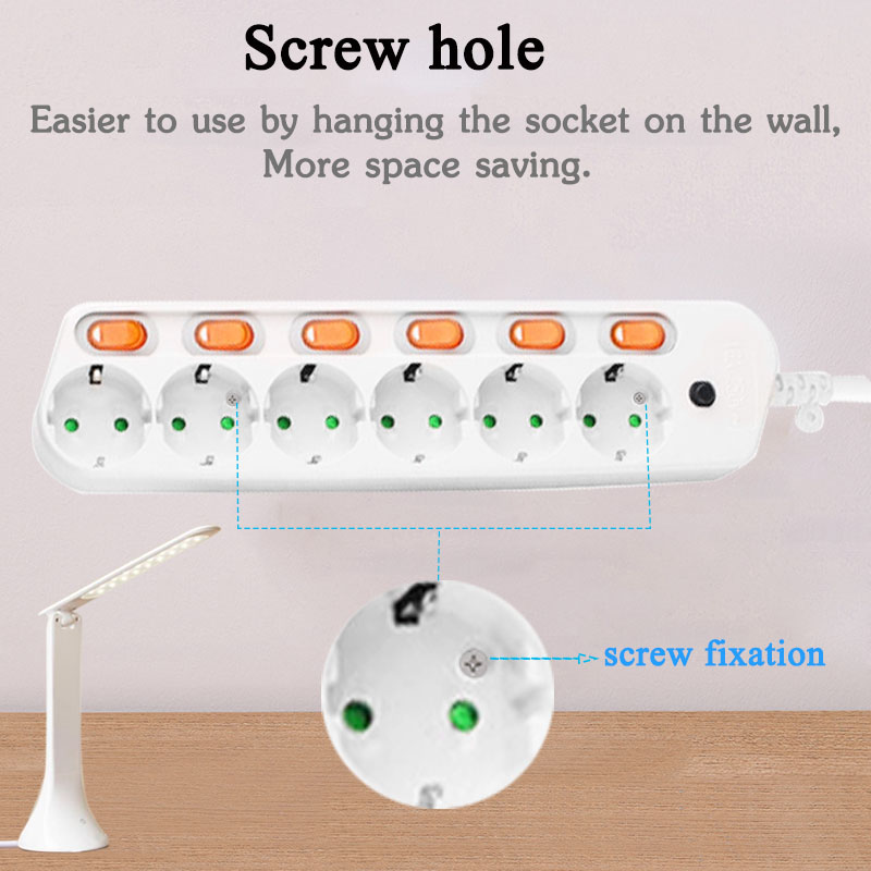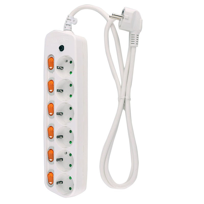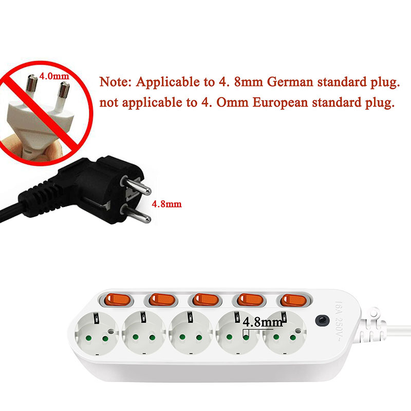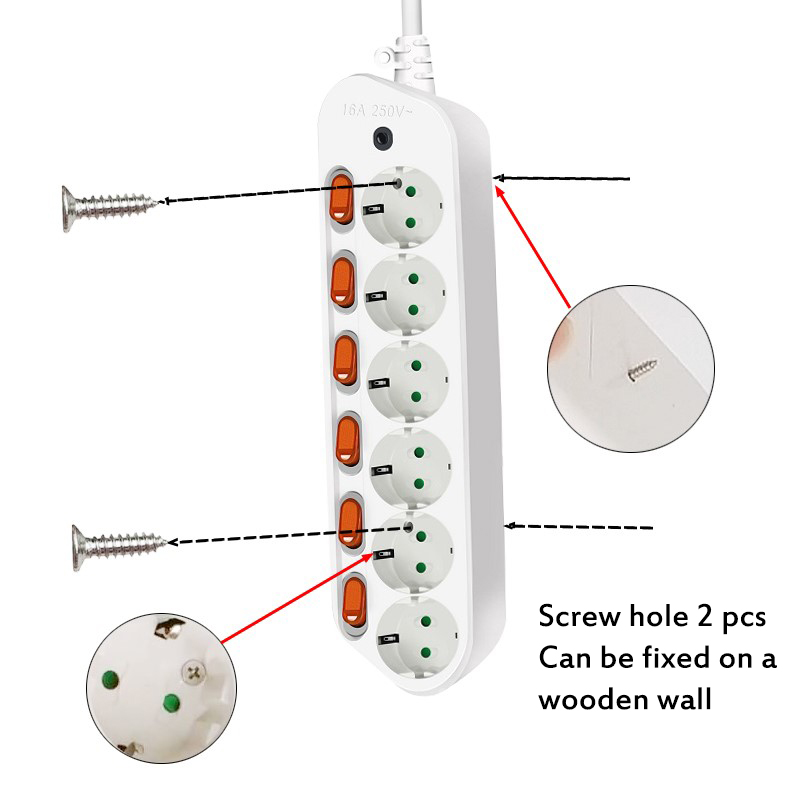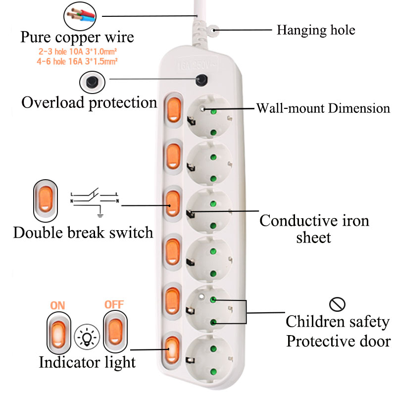 6 отверстий: 16A 3500 Вт (защита от перегрузки) Размер: 295*73*42 мм кабель: 1,5 м/2,5 м