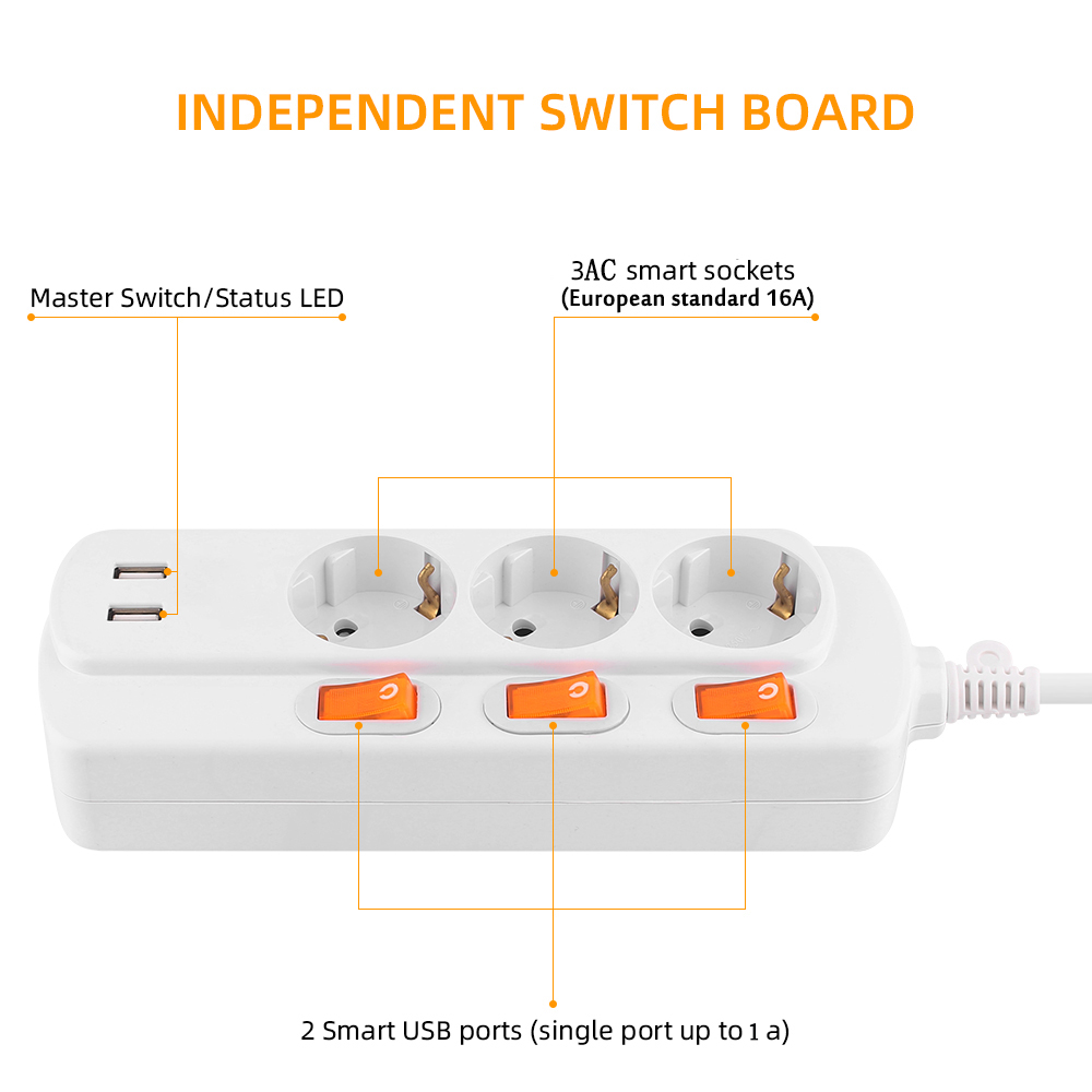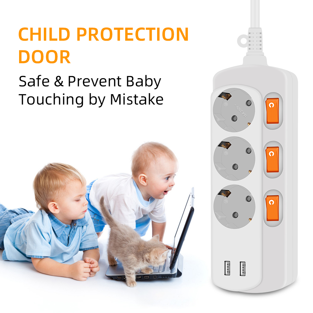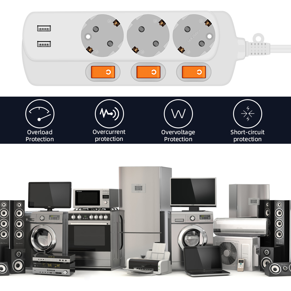 Удлинитель 1,5/2,5 м удлинитель 10/16A 250 В Защита от перегрузки Индивидуально переключаемая вилка европейского стандарта 2/3/4/5/6 удлинитель USB