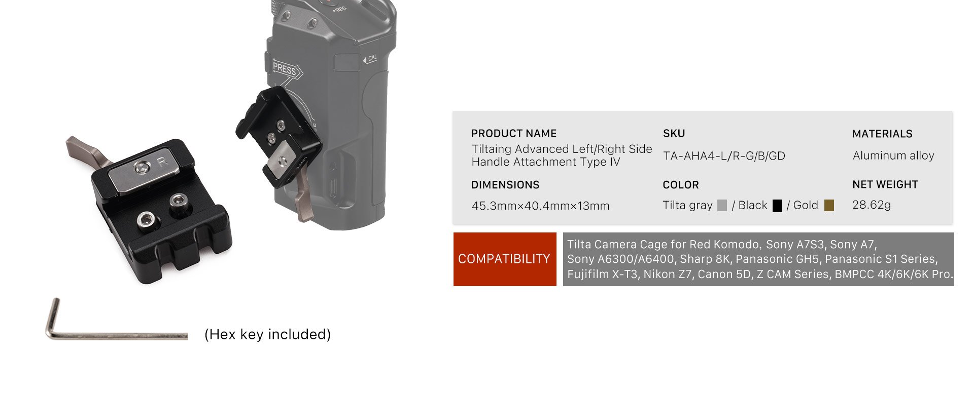 Это вложение позволяет адаптировать любую из боковых ручек Tiltaing Advanced для использования на половинных и полных клетках для камеры Tiltaing для RED Komodo, Sony a7SIII, Panasonic S5 и Panasonic BGH1.