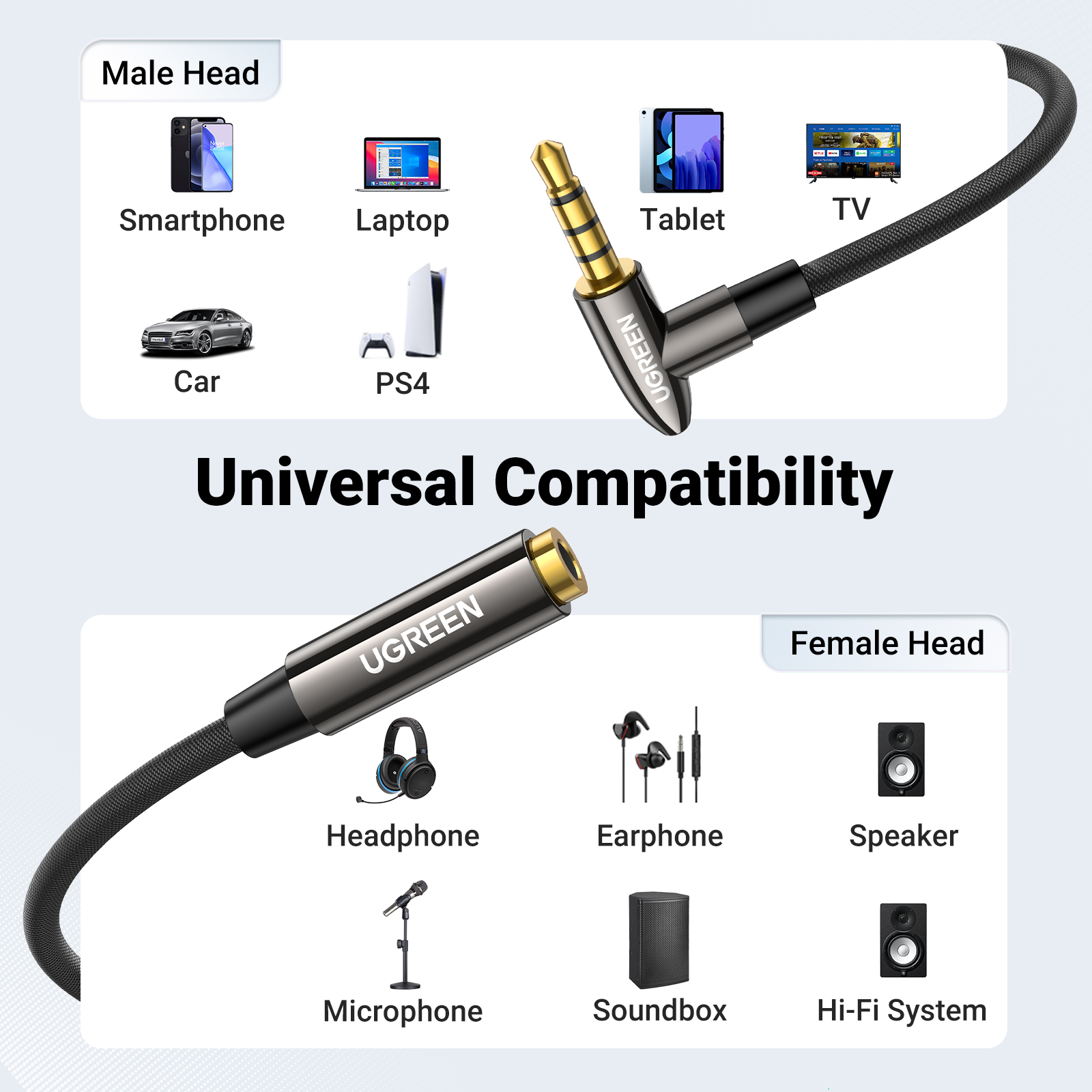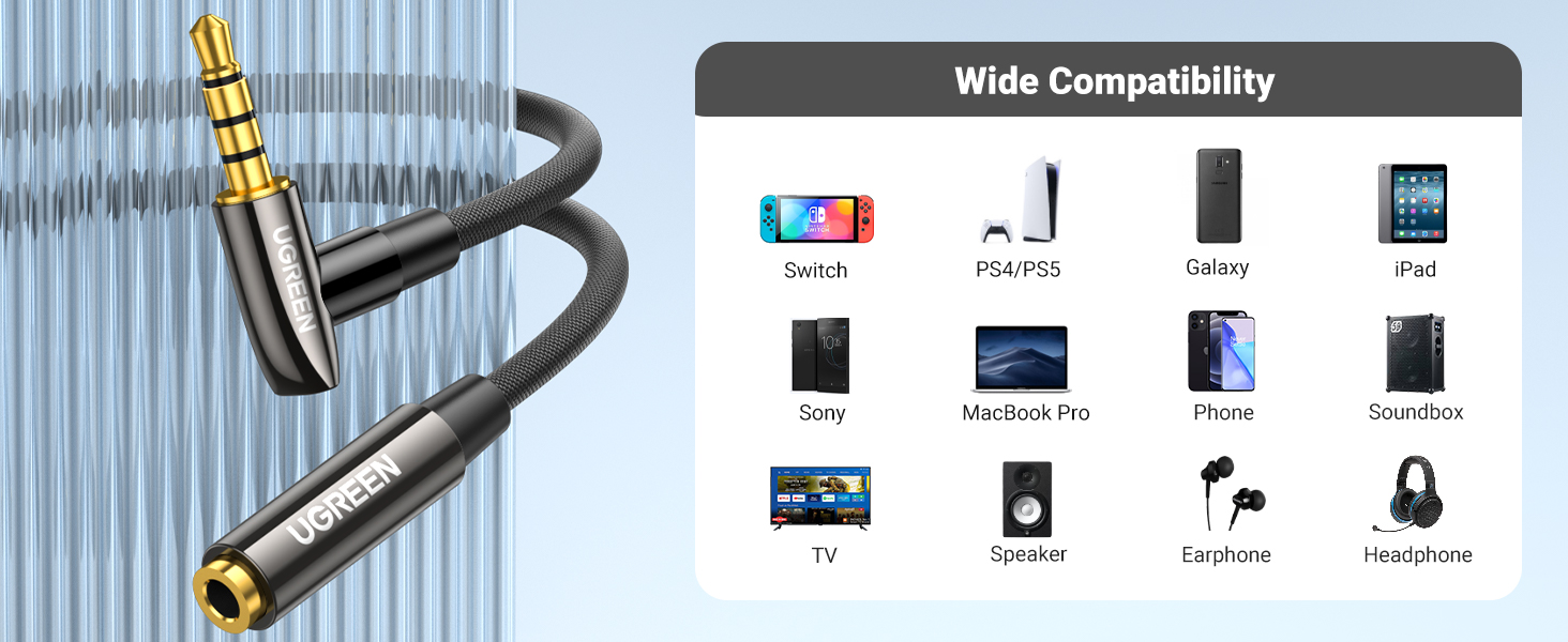 • Универсальная Посадка:Удлинитель вспомогательного шнура UGREEN оснащен ультратонким мини-разъемом 3,5 мм, обеспечивающим плотное прилегание к устройствам со стандартными вспомогательными портами, такими как внешний микрофон 3,5 мм, игровые гарнитуры, наушники, наушники, телевизор, компьютер, ноутбук, настольный компьютер, ПК, планшет, MacBook, iMac, iPod, iPad, Switch Lite, Xbox One/360, контроллер PS5, PS4/PS3, автомобиль, динамик, усилитель, звуковая панель, MP3/MP4-плеер, плеер, DVD-плеер.