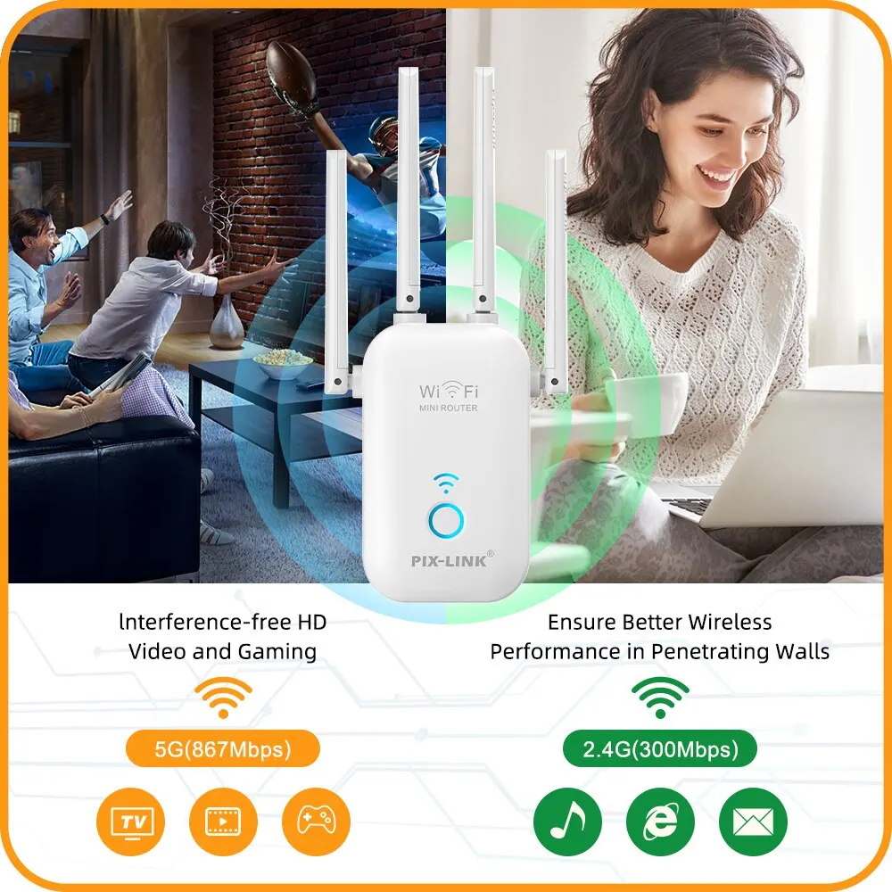 • Высокоскоростной Wi-Fi :Обладая максимальной скоростью передачи данных 1200 Мбит/с, этот ретранслятор обеспечивает молниеносную скорость Интернета, идеально подходящую для потоковой передачи и игр.