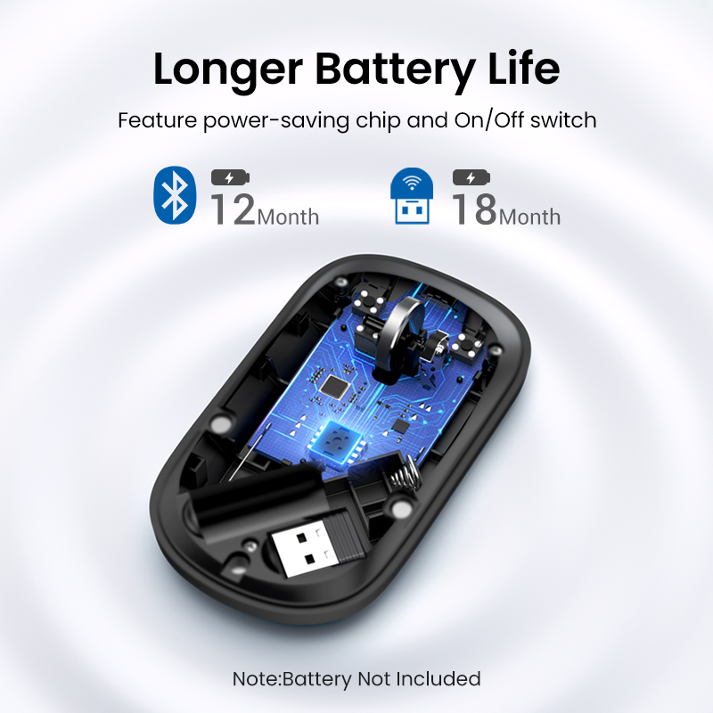 Эта мышь имеет два режима: Bluetooth и 2,4G, поэтому она Поддерживает одновременное подключение 2 компьютеров. Один компьютер подключен через USB-приемник в режиме 2,4G, другой подключен через Bluetooth и может переключаться между 2 компьютерами, нажимая кнопку переключения в нижней части мыши.