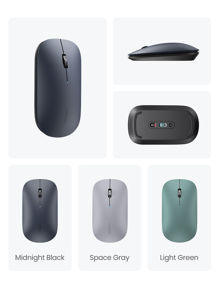 Бренд: UGREEN Номер модели: MU001 Продукт: тонкая беспроводная мышь Способ подключения: Bluetooth5.0 и 2,4G 2 беспроводных режима Толщина мыши: 3 см Нажмите кнопку: кнопка отключения звука, срок службы 3 миллиона раз Прокрутка: металлический материал с бесшумным кодировщиком, срок службы в 300000 раз 4-х уровневый DPI : 1000/1600/2000/4000, настройка по умолчанию 1600 USB-Приемник: 2,4G 250 Гц Расстояние: 15 м Батарея: 1x батарея AA (не входит в комплект) Переключатель DPI: Нажмите нижнюю кнопку DPI, чтобы переключаться циклически Система: Универсальная совместимость (Windows 10/8/7, Mac OS, Chrome OS,Linux и все остальные) Упаковка: Розничная коробка UGREEN * Примечание: для пробуждения мыши, пожалуйста, переместите и щелкните мышью в то же время.
