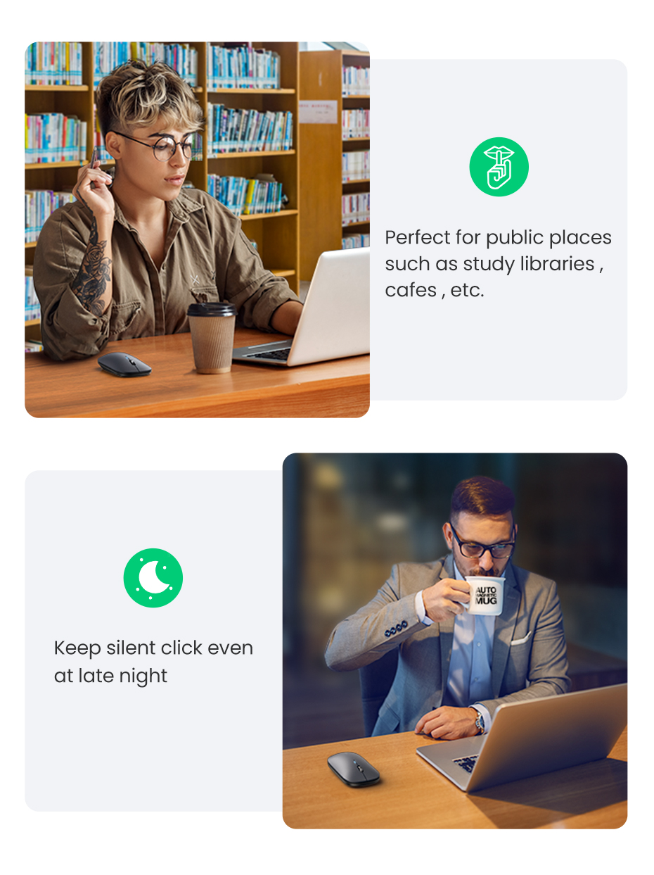 Идеально подходит для общественных мест, таких как учебные библиотеки, кафе и т. д. он сохраняет бесшумный щелчок даже поздно ночью. Это не повлияет на других людей, которые концентрируются на чтении, учебе, работе или сне.