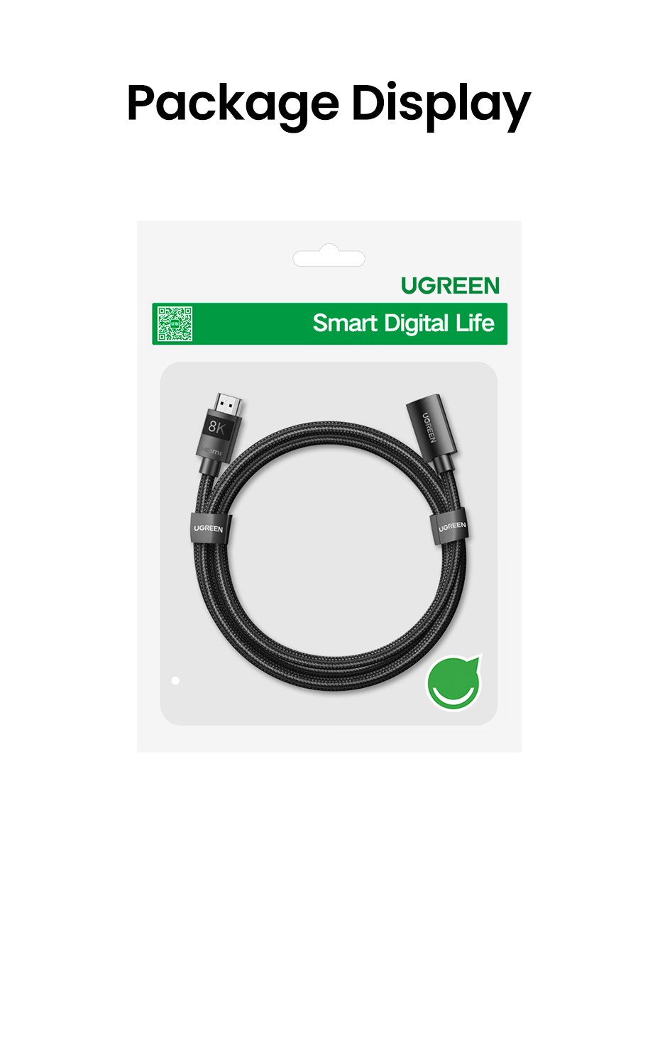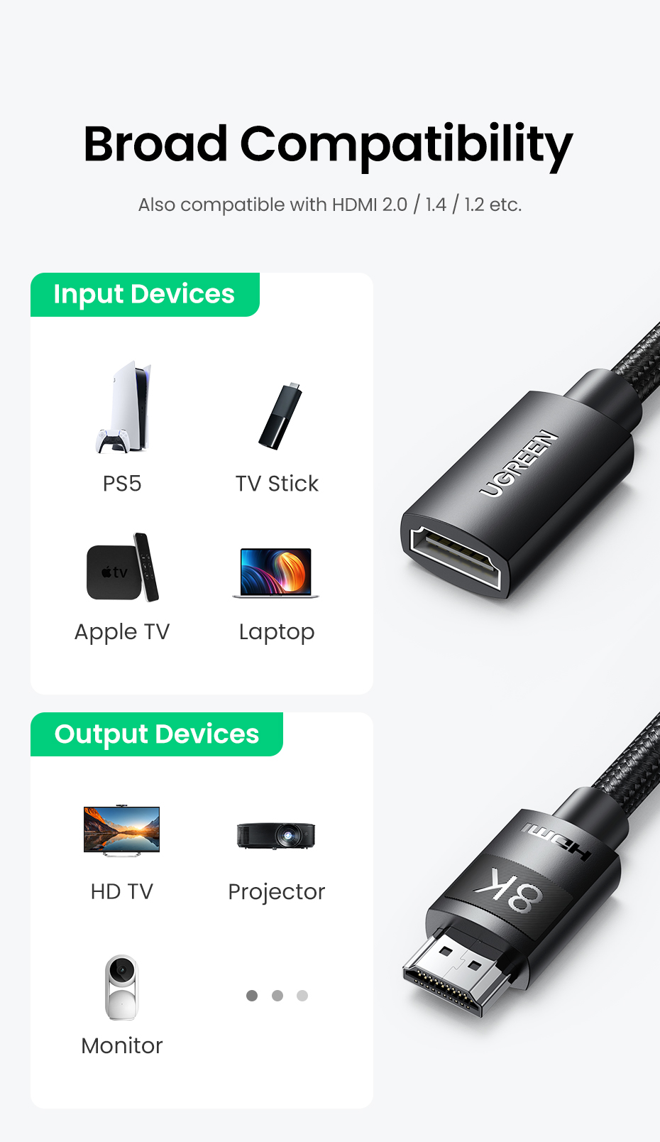 Удлинительный кабель HDMI UGREEN поддерживает разрешение до 7680x4320, частоту обновления до 8K при 60 Гц, 4K при 120 Гц 144 Гц, скорость передачи до 48 Гбит/с, сверхвысокую скорость, HDCP 2,2 и 2,3, динамический HDR. Обратная Совместимость с HDMI 2,0, 1,4.