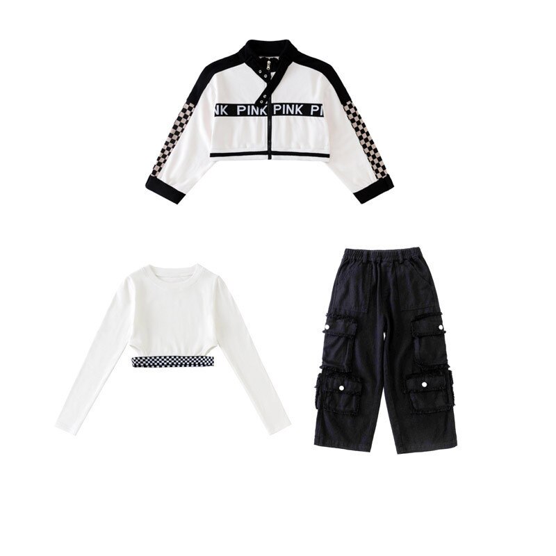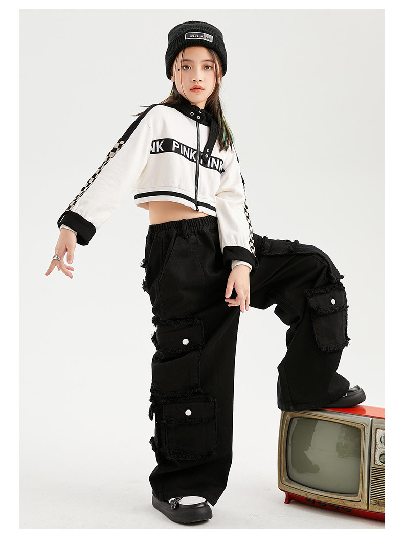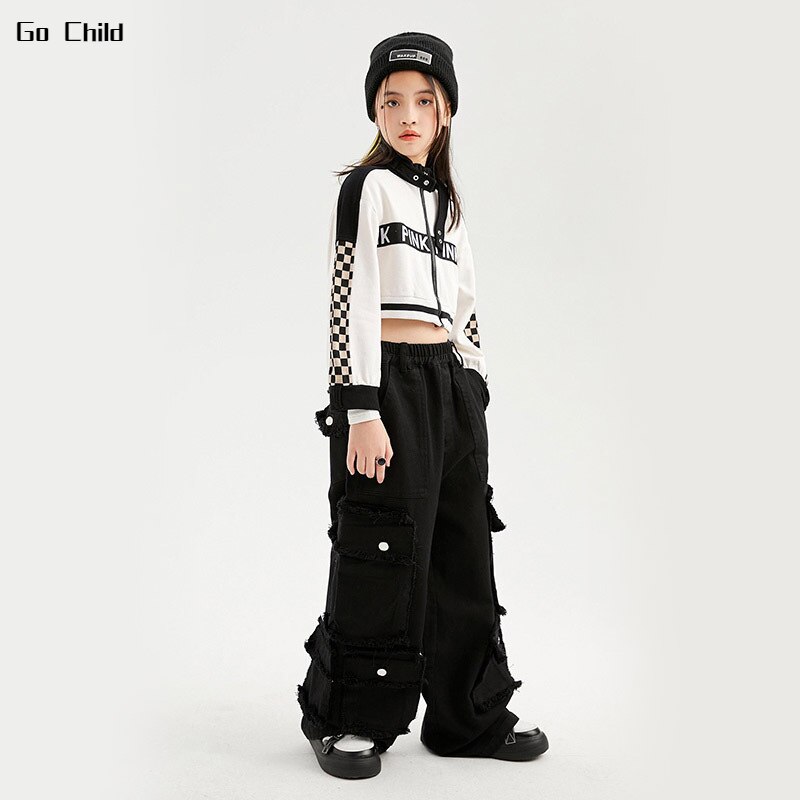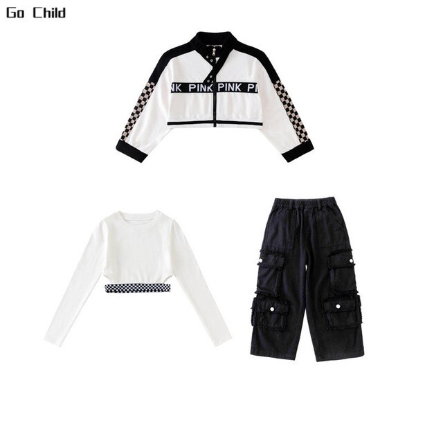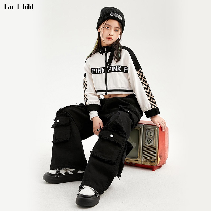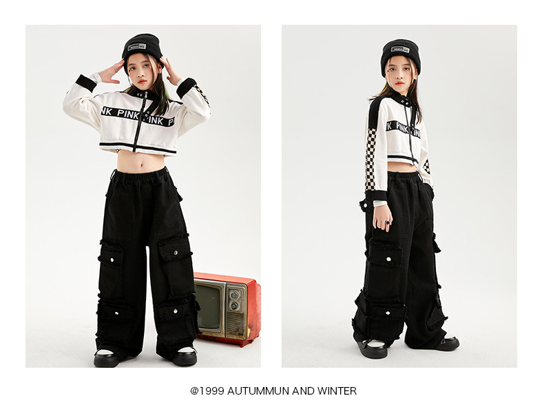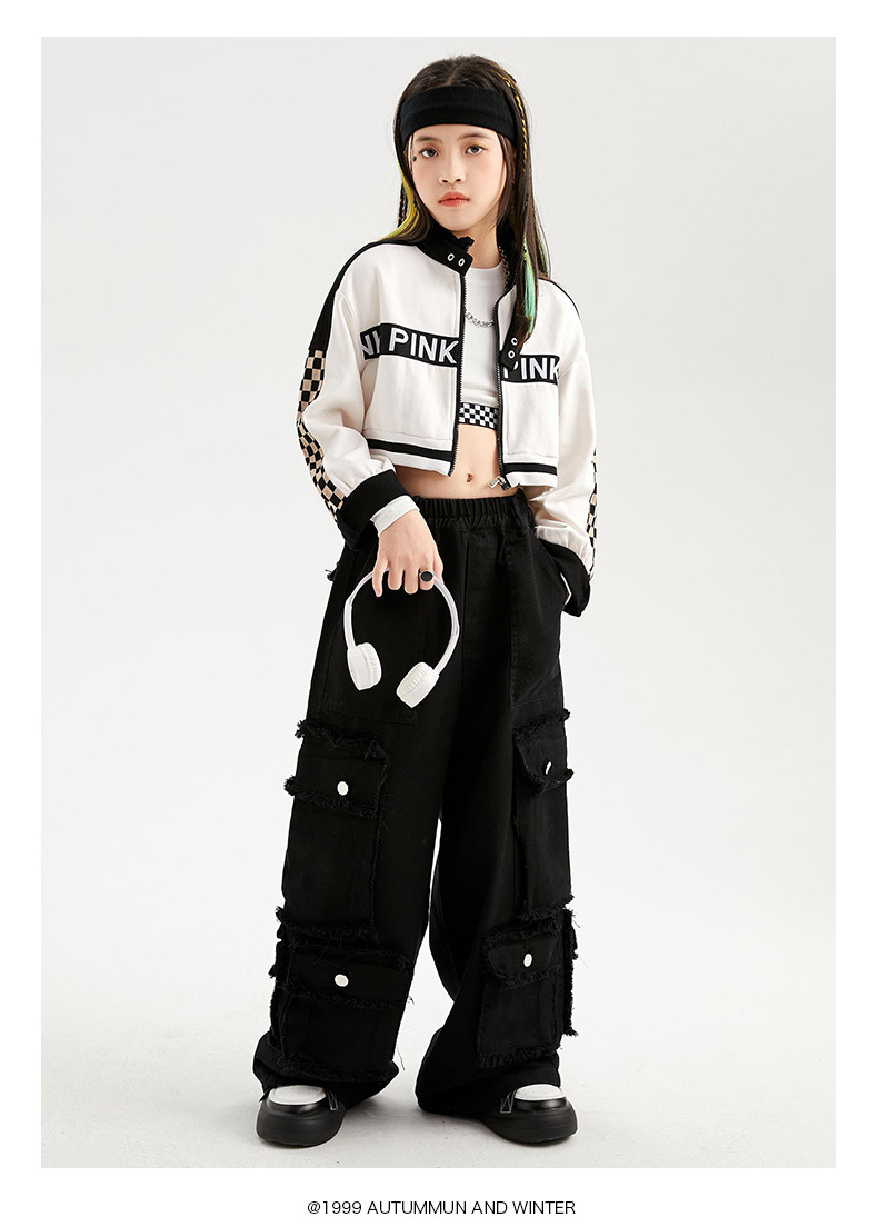 Укороченная куртка для девочек, свободные брюки-карго, Детская уличная одежда в стиле хип-хоп, женские комплекты, детское короткое джазовое пальто, наряды, костюмы