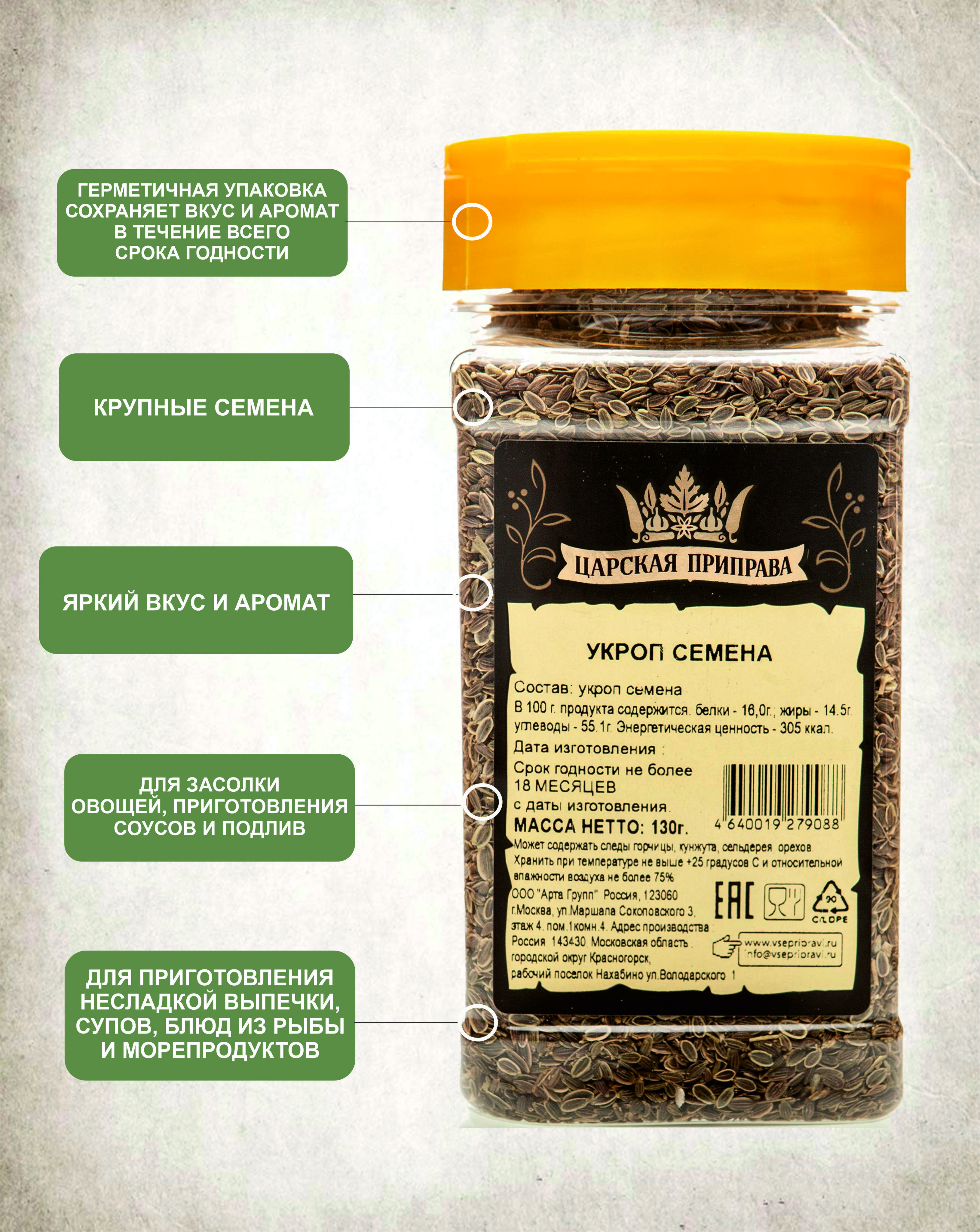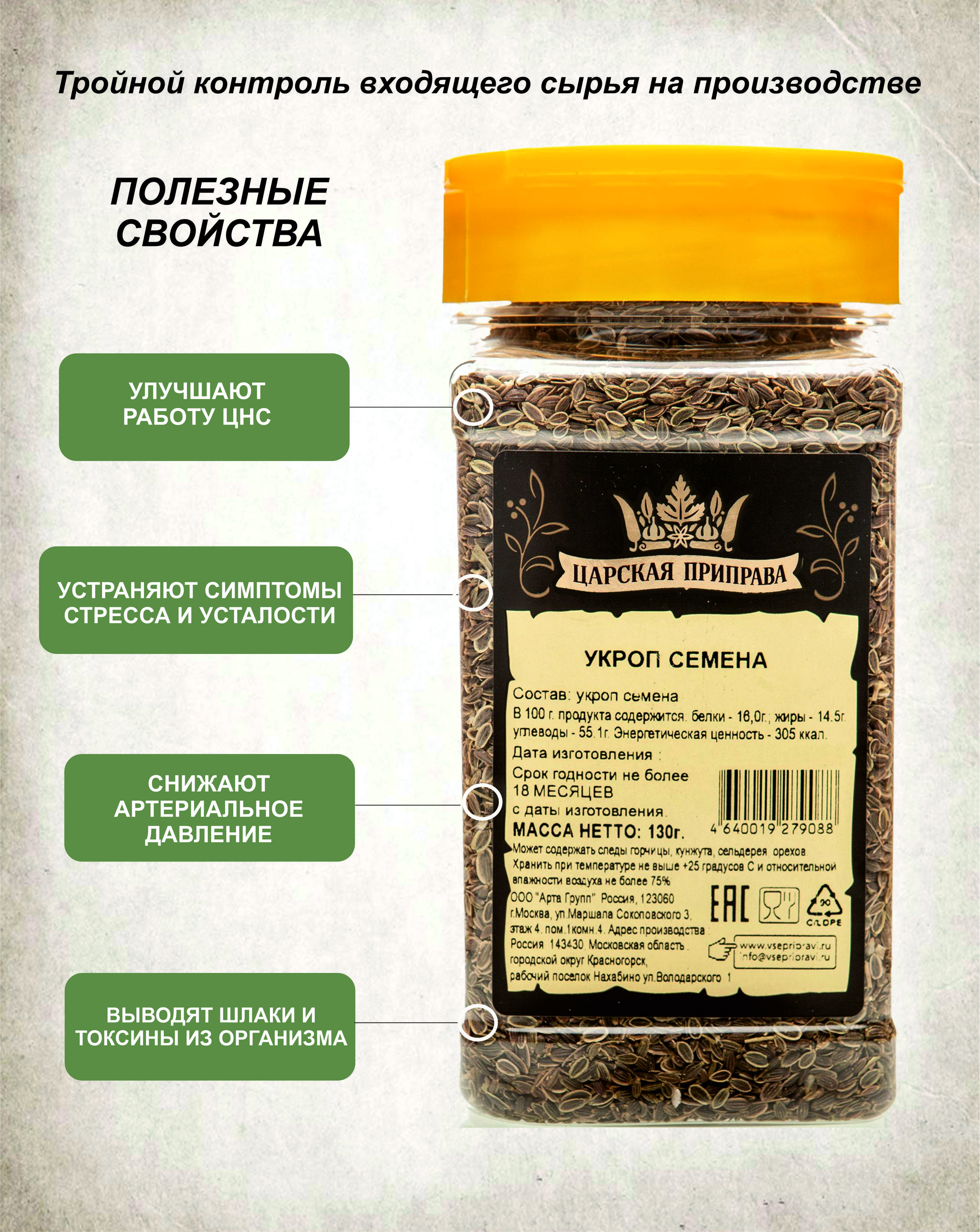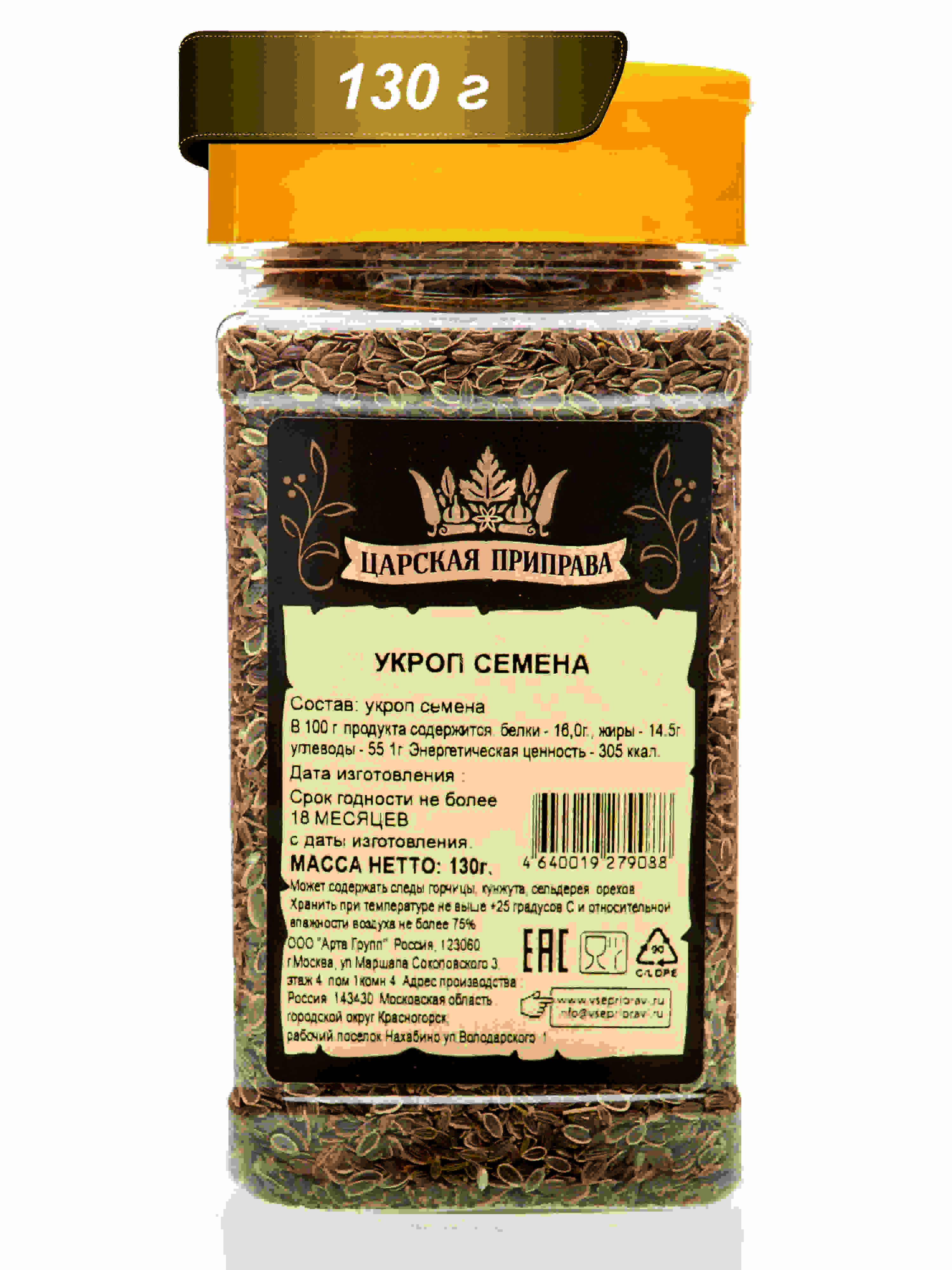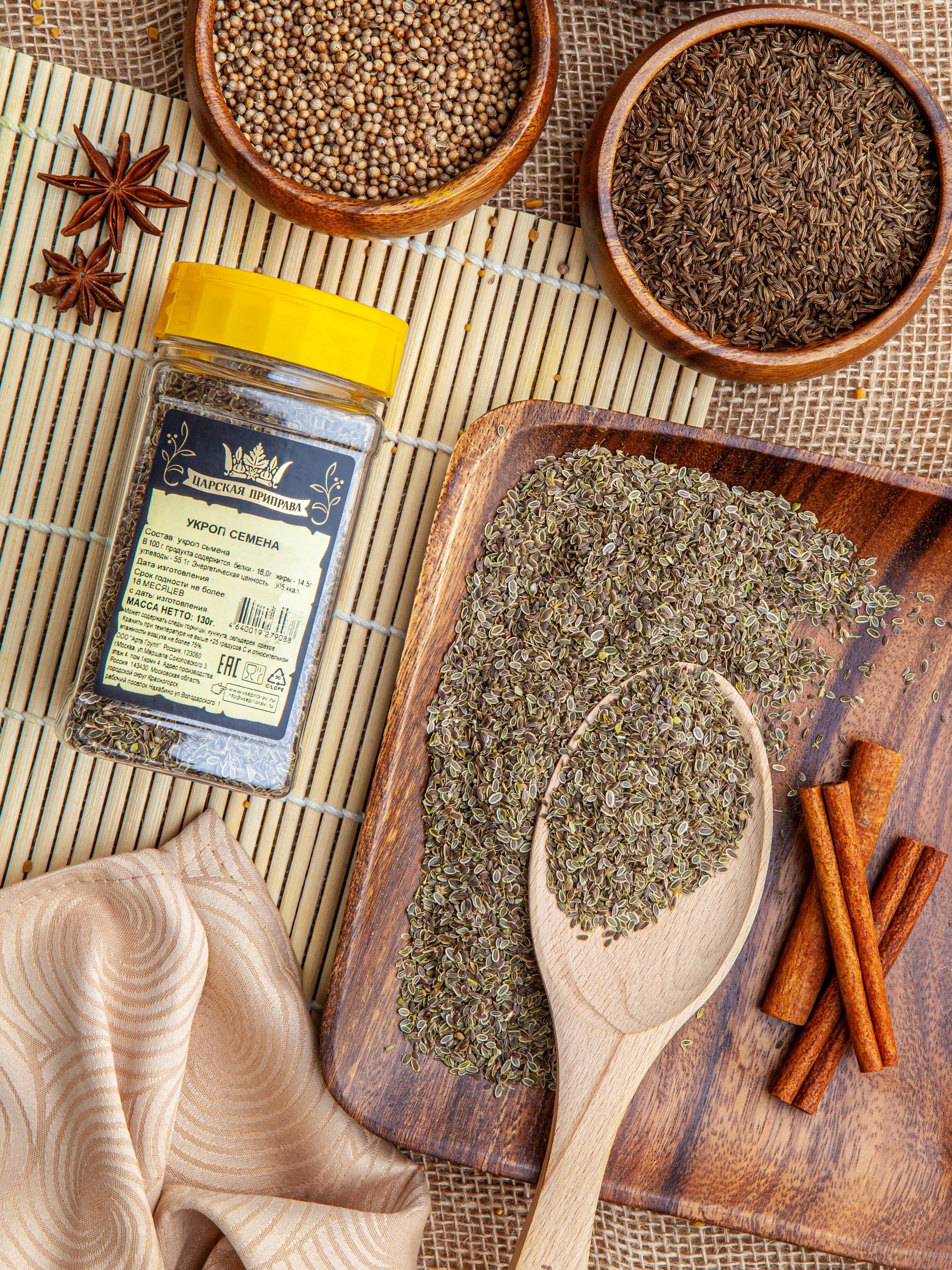 Укроп семена пищевые, натуральные, Царская приправа, ПЭТ с дозатором, 130 г