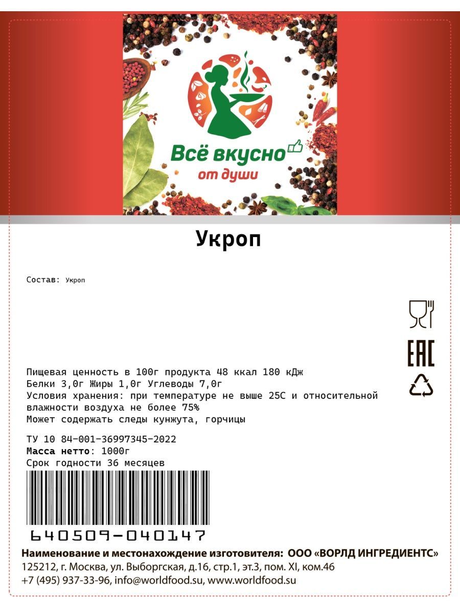 Описание: Укроп вид однолетних травянистых растений семейства Зонтичные, популярное огородное растение, выращиваемое как пряность. В диком виде произрастает в Малой Азии, Северной Африке, Иране, Гималаях. Как культивируемое и сорное растение произрастает на всех континентах.Растение содержит эфирное масло, придающее специфический запах, флавоноиды. Благодаря наличию эфирного масла, набору витаминов и минеральных веществ потребление повышает аппетит, способствует нормализации обмена веществ в организме.Имеет сильный пряный освежающий вкус и запах. Используется как приправа универсальная в свежем, сушёном или соленом виде. Для консервирования овощей, приготовления ароматного уксуса. Укроп сушёный употребляется в смесях пряностей и для приготовления блюд.