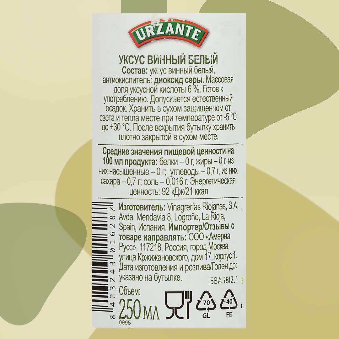 Описание: Уксусы Urzante отличаются высочайшим качеством. Идеальное сочетание для оливкового масла и для всех кулинарных целей, заправок, тушеных блюд, салатов... все с качеством и традициями Урзанте. Белый винный уксус является одним из основных ингредиентов нашей кухни и используется при приготовлении соусов, маринадов, а также для заправки к рыбе и мясу. Этот уксус один из наиболее часто используемых в домашних условиях, с почти прозрачным тоном. Обладает умеренно крепким и ярко выраженным вкусом. Идеально подходит для приготовления некоторых соусов (майонеза, голландского).