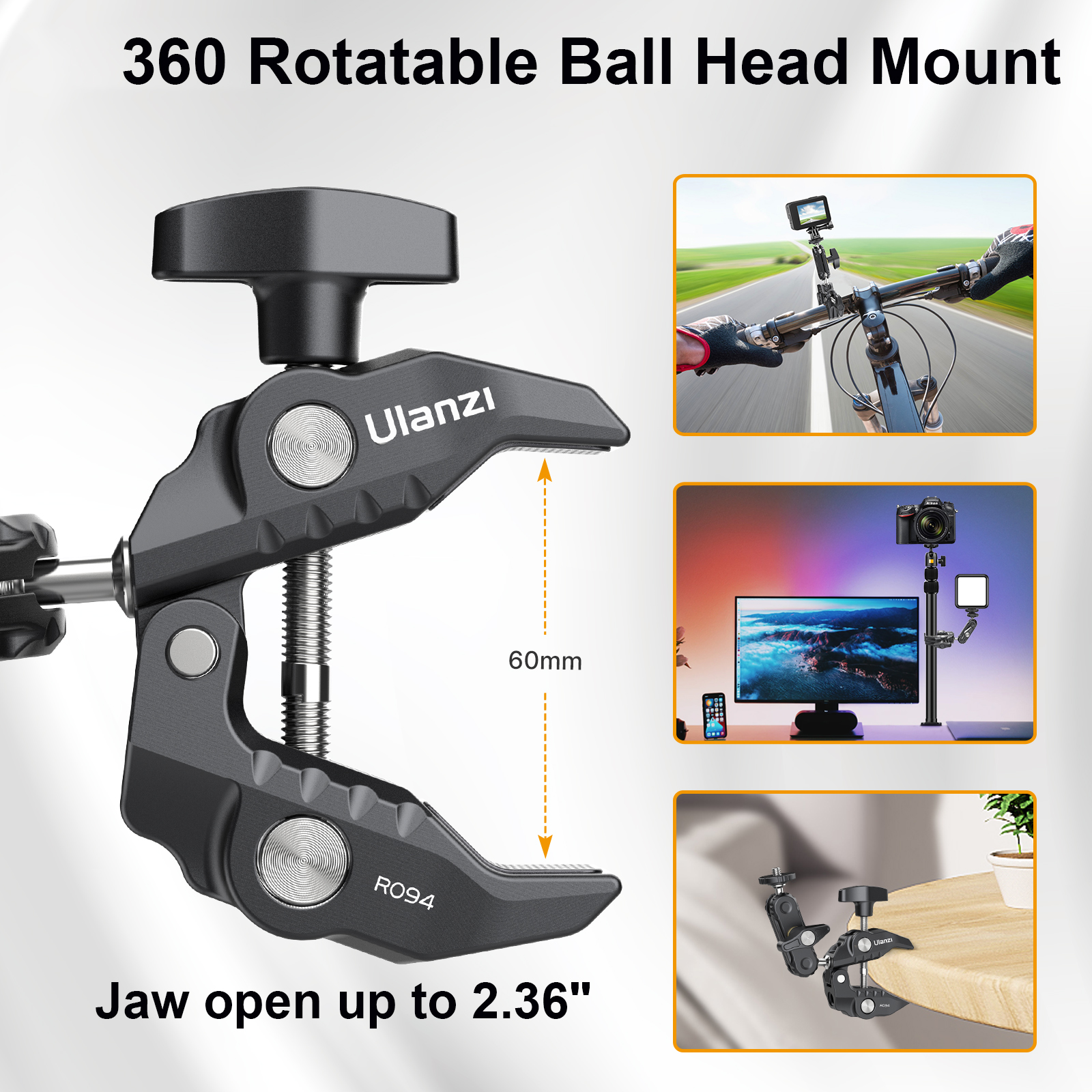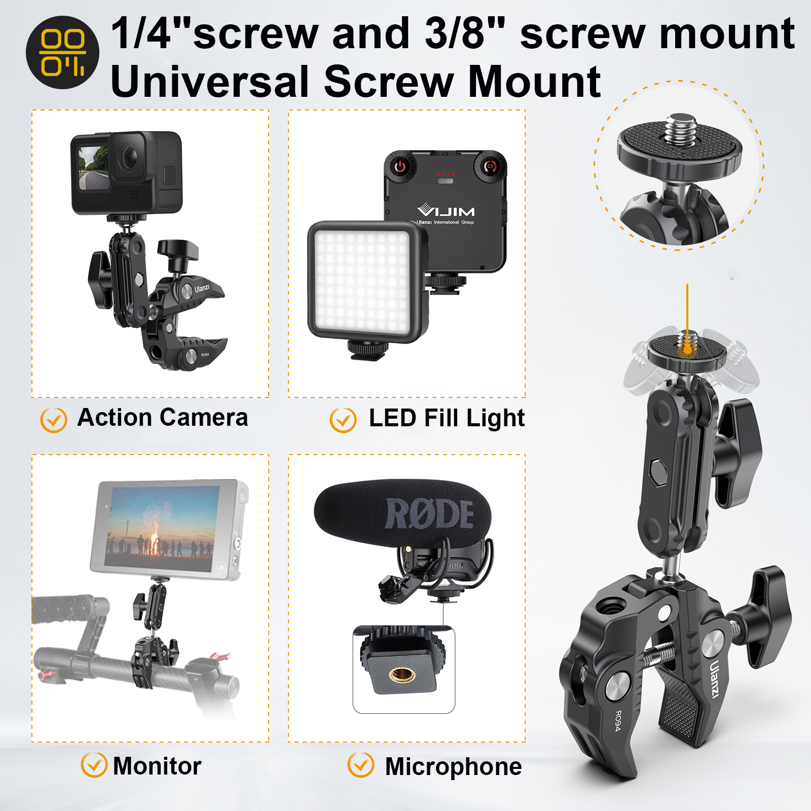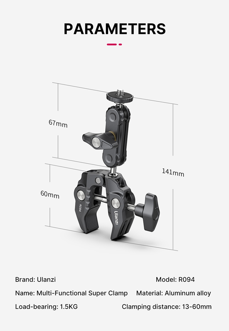Ulanzi-R094 Металлический суперзажим с шаровой головкой на 360 ° Magic Arm Clamp с отверстием 1/4 "3/8" для монитора камеры DSLR Светодиодный микрофон