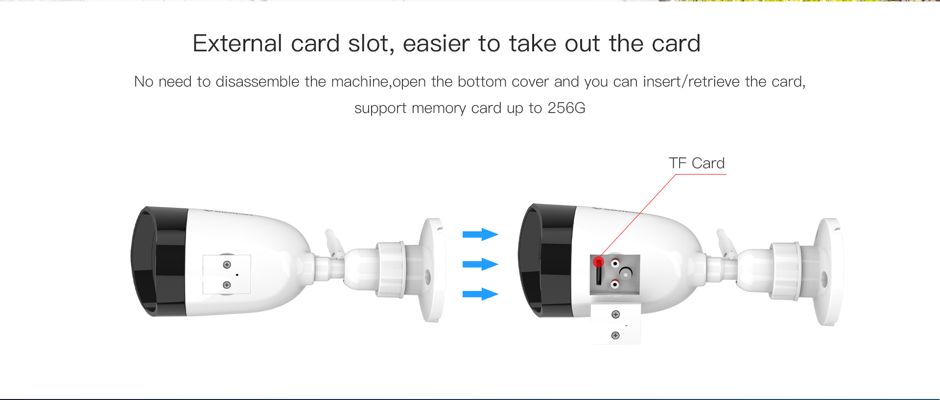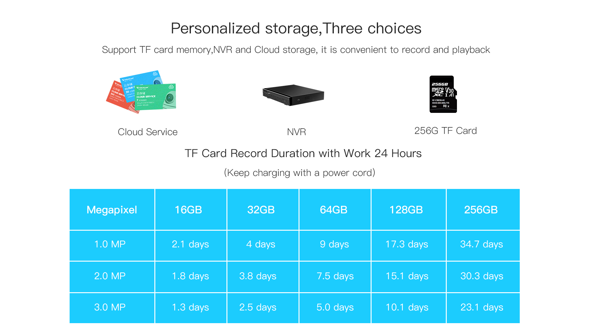 • [ Support Max 256G TF card & Cloud Service  & NVR] - Support max 256G TF card (card not included) storage and Cloud Service (not free) . The video loop record in TF card automatically. You can live-stream your footage or play back based on your preference (live-stream doesnot include audio). Cloud Service  will record motion detection happens. It records 24 hours on NVR.