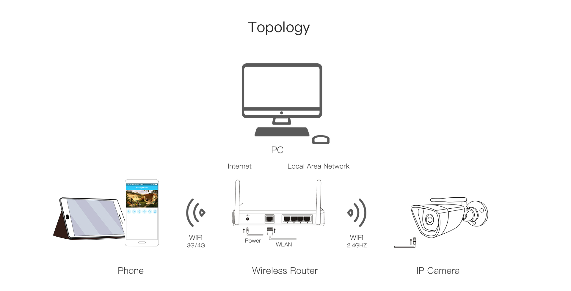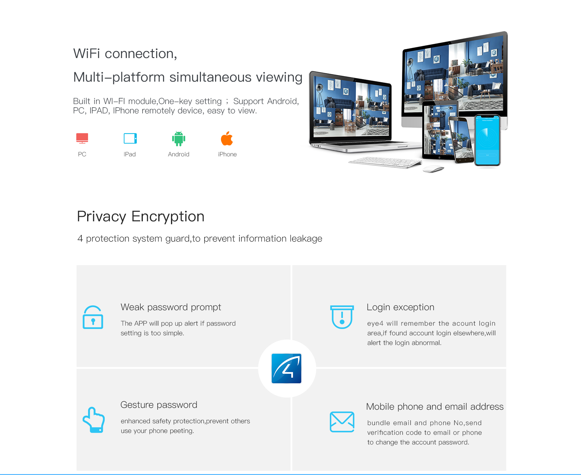 • [ Supported devices ] - Support Android or IOS mobile phone / Windows PC. Max 4 devices can view simultaneously. One device can add Max 64 cameras. Support 2.4Ghz wifi (does not support 5Ghz wifi currently), IEEE802.22b/g/n.