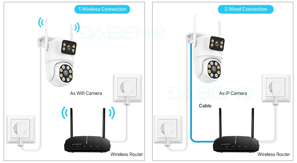 Питание от адаптера постоянного тока 12 В, вы можете подключить камеру к сети Wi-Fi. Вы можете настроить Wi-Fi-соединение камеры или поиск по локальной сети с помощью сетевого кабеля, подключенного к маршрутизатору, работать только с 2,4G Wi-Fi (не поддерживает 5G).