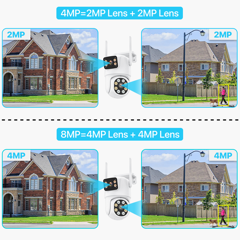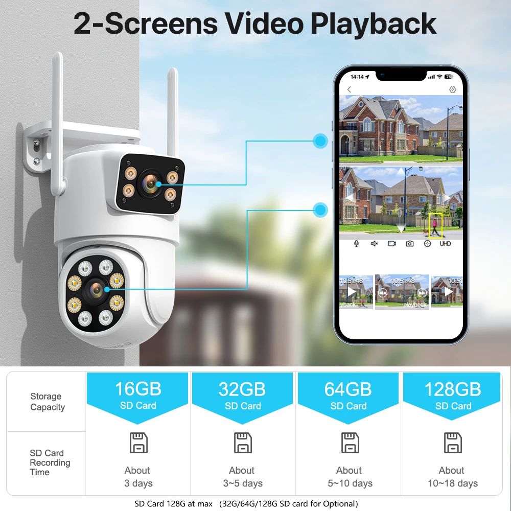 Двойной объектив, двойной экран, сигнализация с уведомлениями, отслеживание гуманоидов, Двусторонняя голосовая связь 360 мониторинг, полноцветное ночное видение, водонепроницаемость IP66, мобильный телефон Удаленный мониторинг, обмен видео, хранение SD-карт, 24 часа записи видео