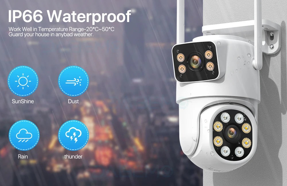 Оснащен водонепроницаемым уровнем IP66, чтобы Камера могла выдерживать различные суровые условия. Рабочая температура-20 ° ~ 50 °, вы можете абсолютно легко положить его на улицу