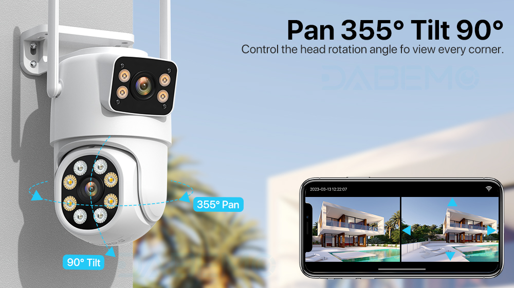 Благодаря горизонтальному 355 ° и вертикальному 90 ° вы можете удаленно управлять наружная камера wifi, чтобы просматривать каждый угол через свой мобильный телефон.