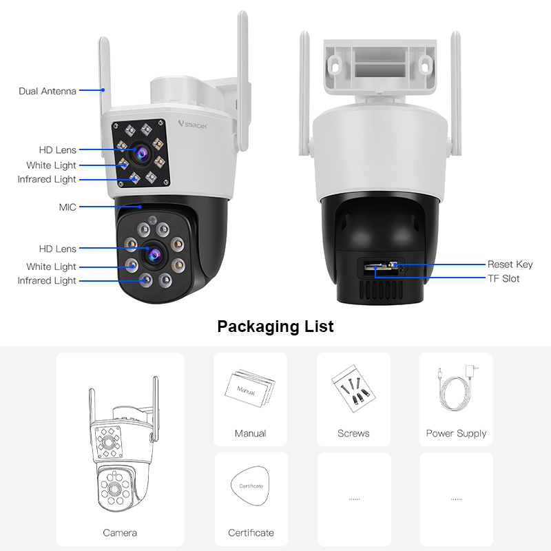 Двойной объектив, Двойной экран, Уведомления о тревоге, гуманоид слежения, двухсторонний голосовой домофон 360 мониторинга, полноцветный ночного видения, IP66 водонепроницаемый, мобильный телефон удаленного мониторинга, обмениваться видео, SD-карты памяти, 24-часовая запись видео