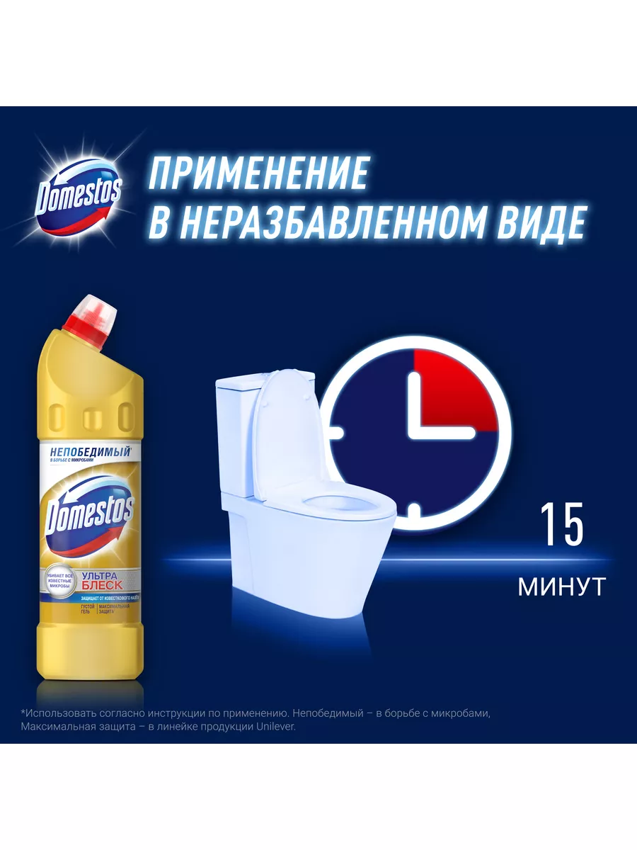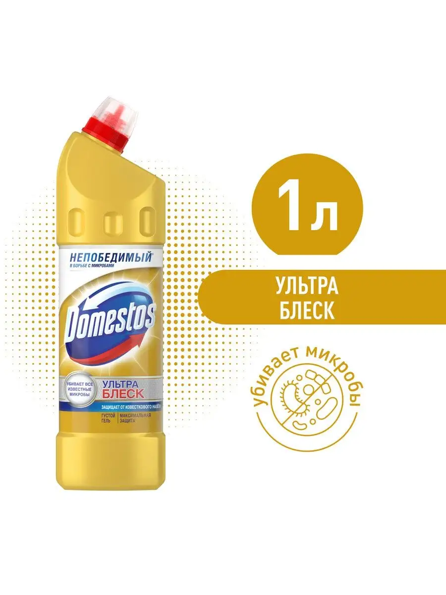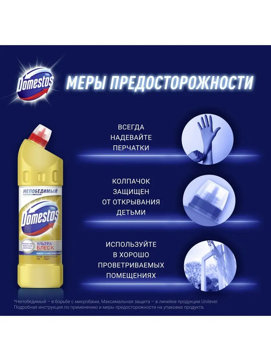 Описание: Обеспечьте в доме блестящую чистоту и защиту от микробов надолго вместе с универсальным чистящим гелем Domestos Ультра Блеск. Густой экономичный гель помогает устранять неприятные запахи, бактерии, грибки, вирусы и споры во всем доме. Доместос гель универсальный Ультра Блеск можно купить и использовать в разбавленном или неразбавленном виде для очищения и уборки туалета, ванны, раковины, плитки, рабочих поверхностей на кухне и полов. Универсальный чистящий гель Domestos Ультра блеск оснащен специальном колпачком от открывания детьми. Чтобы открыть, надавите на уплотнения по бокам колпачка и поверните против часовой стрелки. Чтобы закрыть, поверните колпачок по часовой стрелке до щелчка. Применение Доместос Ультра Блеск возможно не только для мытья различных поверхностей, но и для очищения водостоков на кухне и в ванной, для обработки кухонных губок и использования в септиках.