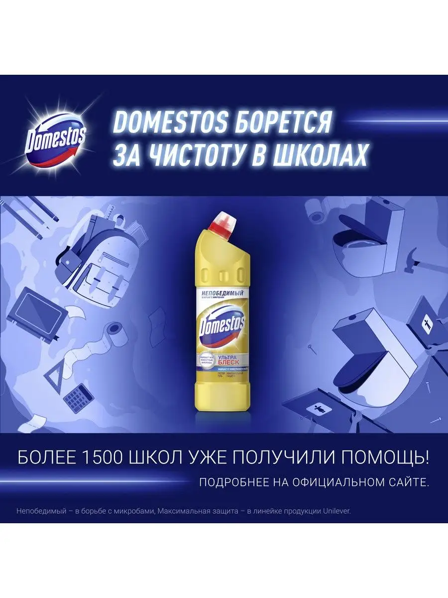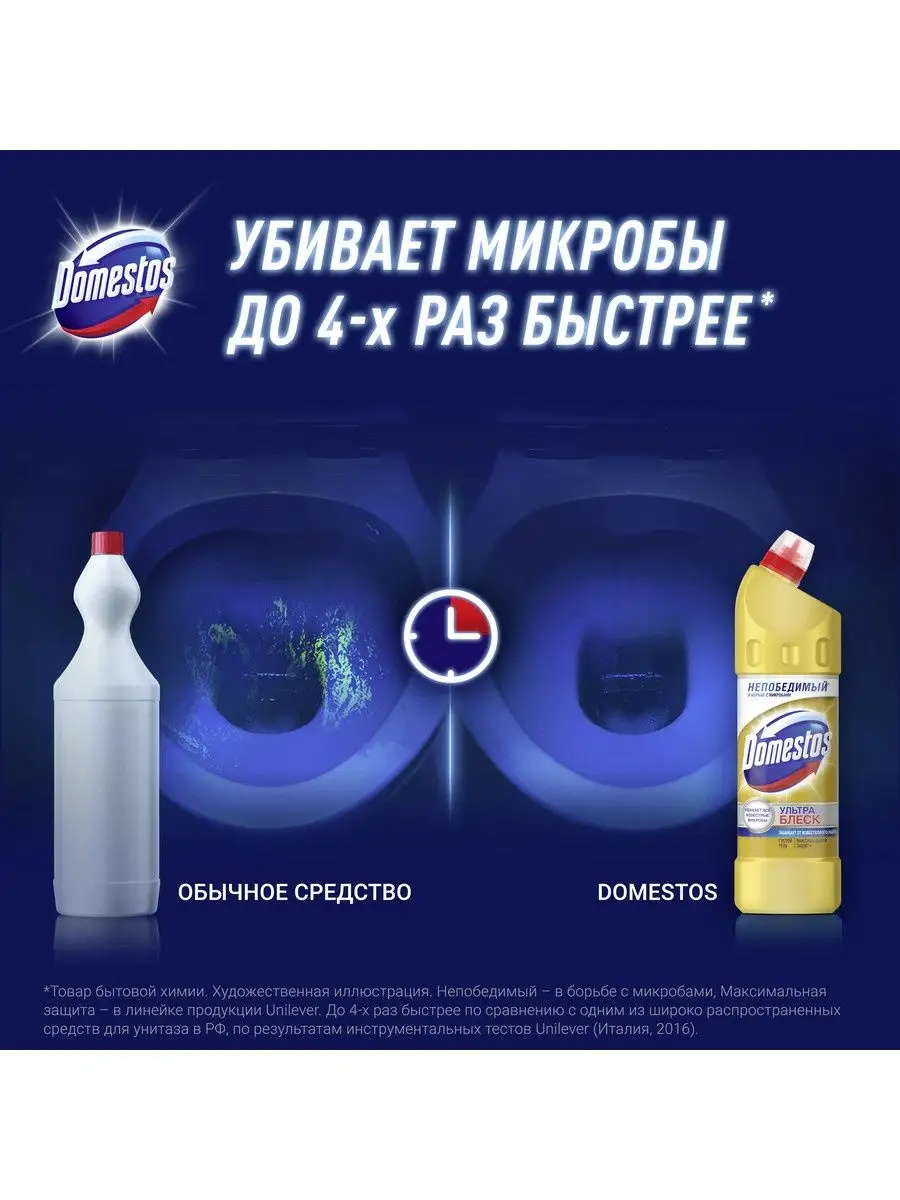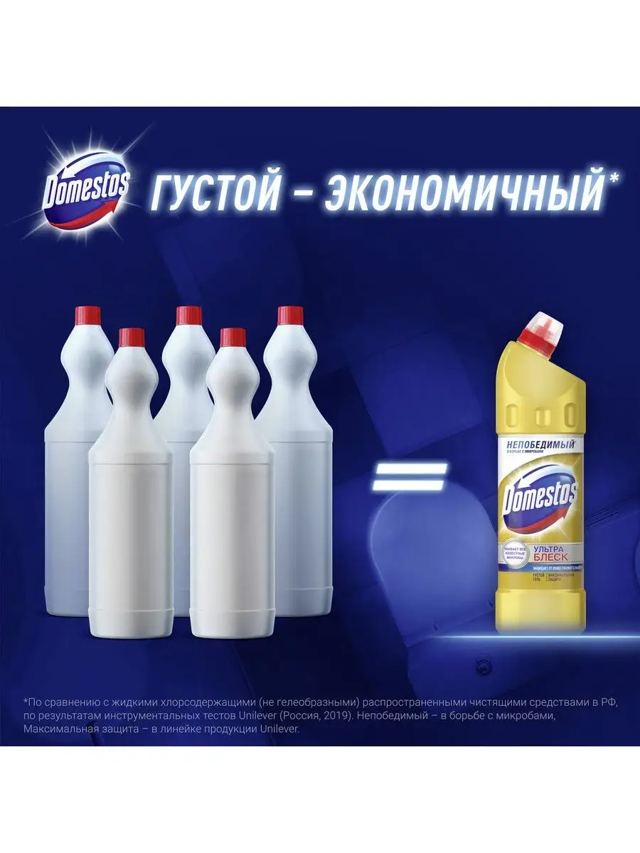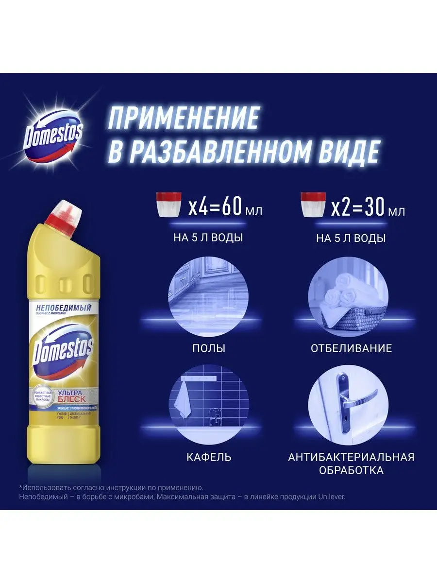 Описание: Обеспечьте в доме блестящую чистоту и защиту от микробов надолго вместе с универсальным чистящим гелем Domestos Ультра Блеск. Густой экономичный гель помогает устранять неприятные запахи, бактерии, грибки, вирусы и споры во всем доме. Доместос гель универсальный Ультра Блеск можно купить и использовать в разбавленном или неразбавленном виде для очищения и уборки туалета, ванны, раковины, плитки, рабочих поверхностей на кухне и полов. Универсальный чистящий гель Domestos Ультра блеск оснащен специальном колпачком от открывания детьми. Чтобы открыть, надавите на уплотнения по бокам колпачка и поверните против часовой стрелки. Чтобы закрыть, поверните колпачок по часовой стрелке до щелчка. Применение Доместос Ультра Блеск возможно не только для мытья различных поверхностей, но и для очищения водостоков на кухне и в ванной, для обработки кухонных губок и использования в септиках.