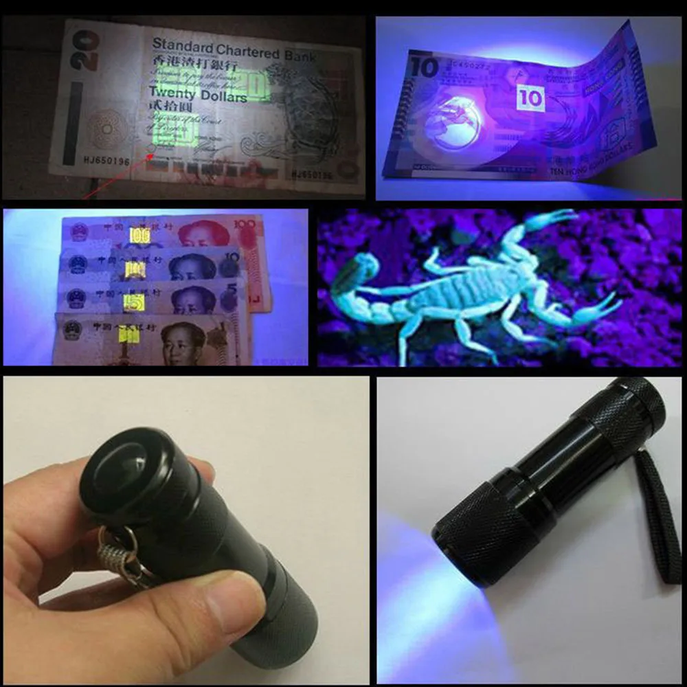 Мини 9LED УФ-фонарик Ультрафиолетовый светодиодный фонарик Ультрафиолетовые невидимые чернила Обнаружение маркера Фонарик 3AAA УФ-лампа