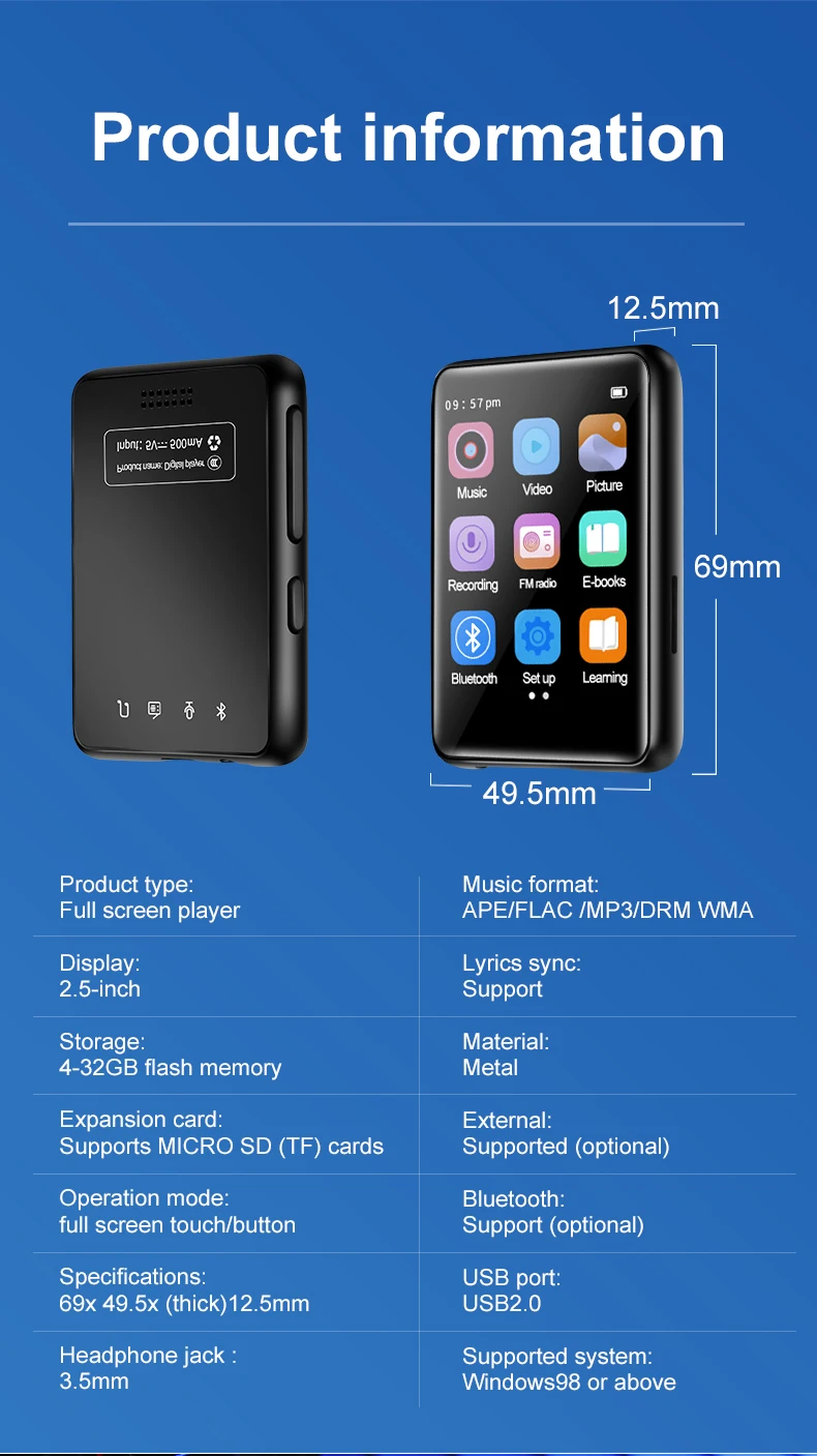 2,5 дюймов полный экран mp3mp4 Walkman Студенческая версия мини ультра-тонкий bluetooth 5,0 Портативный сенсорный экран mp5 плеер поддерживает карты внешнего воспроизведения